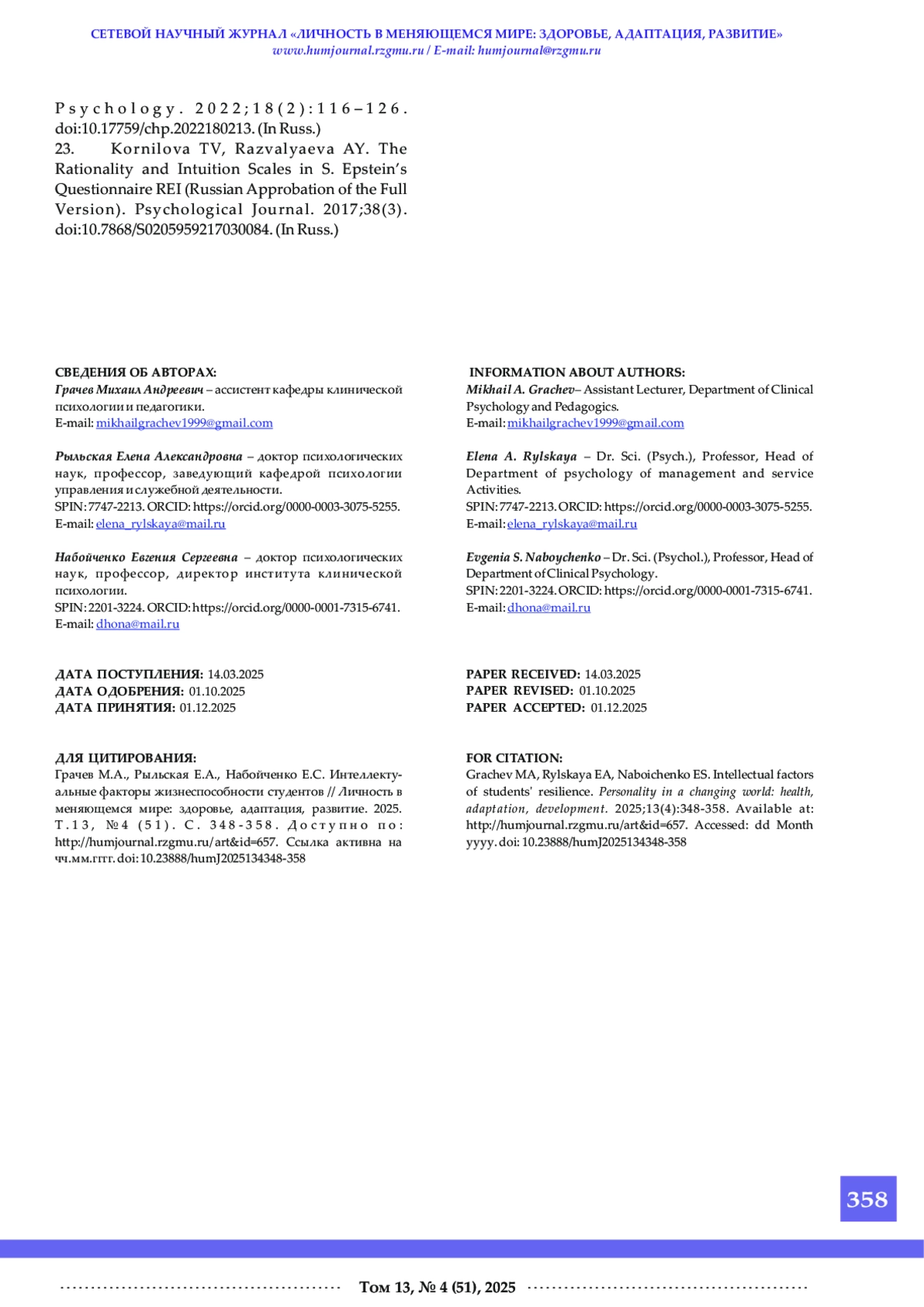 23. Kornilova TV, Razvalyaeva AY. The Rationality and Intuition Scales in S. Epstein’s Questionnaire REI (Russian Approbation of the Full Version). Psychological Journal. 2017;38(3). (In Russ.).