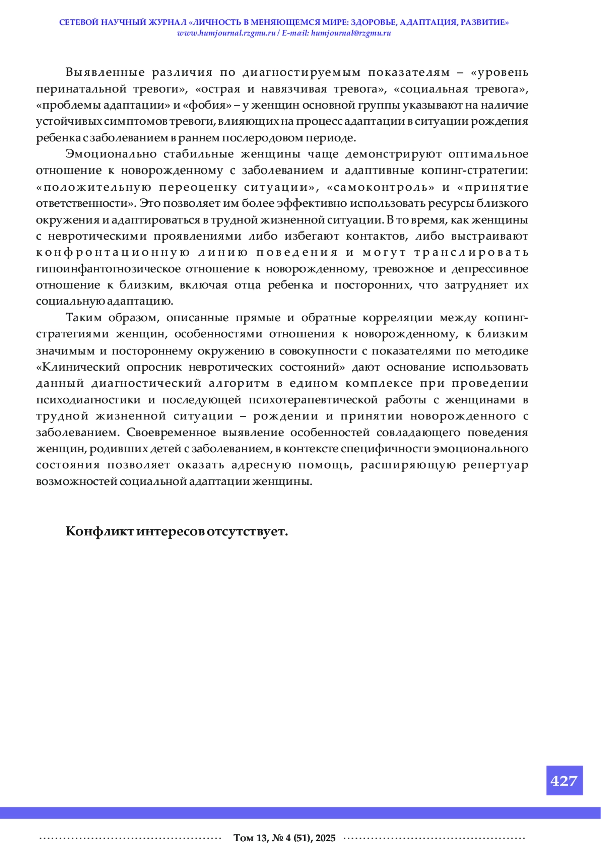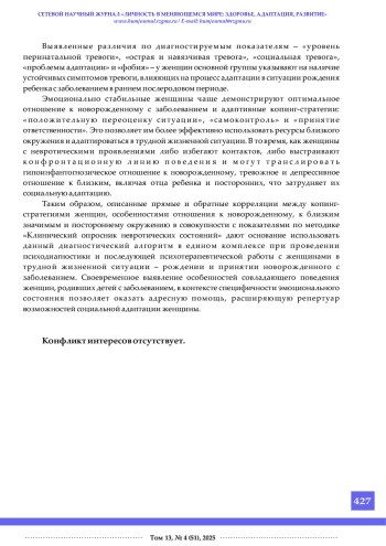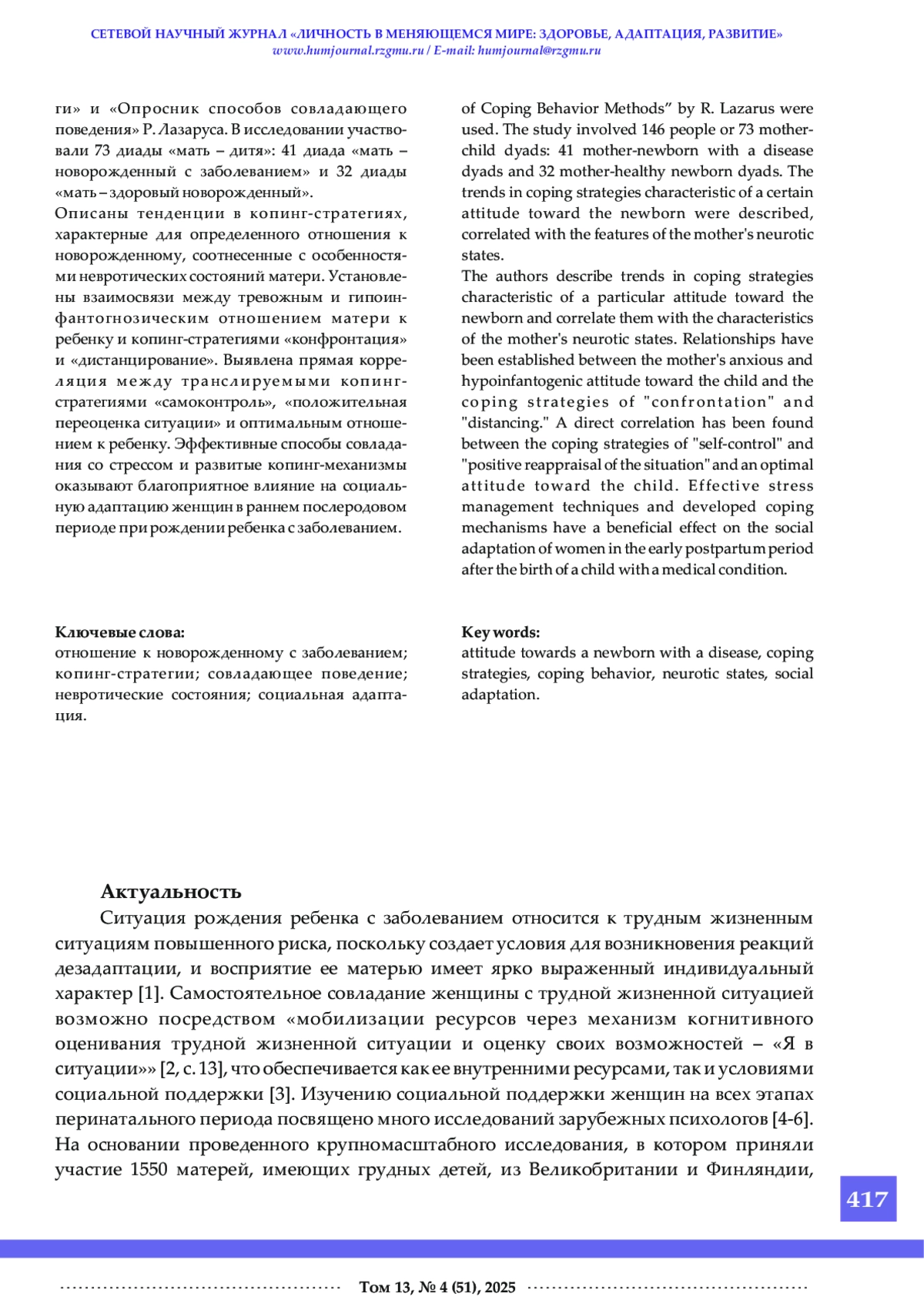 Вопросы взаимосвязи эмоционального состояния женщины в раннем послеродовом периоде, транслируемого отношения к новорожденному и стратегий совладающего поведения при рождении ребенка с заболеванием является недостаточно изученными. Научная новизна исследования рассматривается с точки зрения уникальности выборки. Целью исследования стало изучение особенностей совладающего поведения женщин, родивших детей с патологией, в контексте специфичности эмоционального состояния: при клинических симптомах невротизации и при стабильном эмоциональном статусе. Применялись адаптированная форма методики «Тест отношений беременной», Клинический опросник невротических состояний, методика «Уровень перинатальной тревоги» и «Опросник способов совладающего поведения» Р. Лазаруса. В исследовании участвовали 73 диады «мать-дитя»: 41 диада «мать-новорожденный с заболеванием» и 32 диады «мать - здоровый новорожденный». Описаны тенденции в копинг-стратегиях, характерные для определенного отношения к новорожденному, соотнесенные с особенностями невротических состояний матери. Установлены взаимосвязи между тревожным и гипоинфантогнозическим отношением матери к ребенку и копинг-стратегиями «конфронтация» и «дистанцирование». Выявлена прямая корреляция между транслируемыми копинг-стратегиями «самоконтроль», «положительная переоценка ситуации» и оптимальным отношением к ребенку. Эффективные способы совладания со стрессом и развитые копинг-механизмы оказывают благоприятное влияние на социальную адаптацию женщин в раннем послеродовом периоде при рождении ребенка с заболеванием.