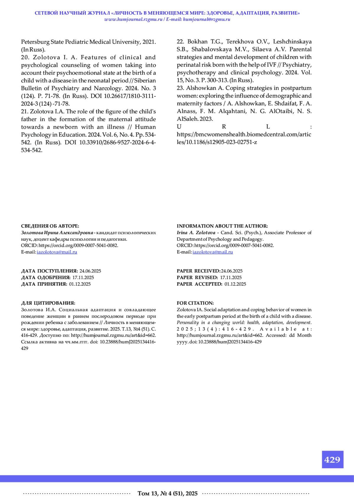 21. Zolotova I.A. The role of the figure of the child’s father in the formation of the maternal attitude towards a newborn with an illness // Human Psychology in Education. 2024. Vol. 6, No. 4. Pp. 534542. (In Russ). DOI: 10.33910/2686-9527-2024-6-4534-542