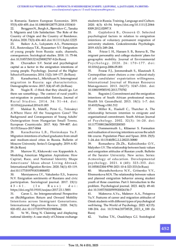 39. Romasheva Zh.Zh., Kalinichenko O.V., Malyshev I.V. The relationship between basic values and emigration attitudes of Russian youth. Bulletin of the Saratov University. New series. Series: Acmeology of education. Developmental psychology. 2021. 4 (40): 323-333. DOI: 10.18500/2304-9790-2021-10-4-323-333