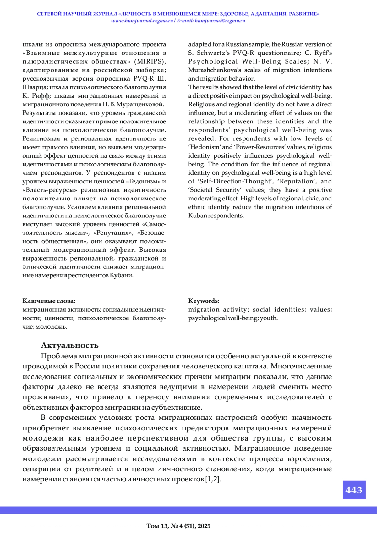 Проблема сохранения человеческих ресурсов особенно остро встает в эпоху глобализации, когда наиболее активная и креативная часть сообщества, прежде всего, молодежь, получила возможность свободно менять место работы и проживания, переезжать в другой город, регион, страну. В данной статье миграционная активность рассматривается как сложная полимотивированная система, включающая ценности, социальные идентичности и психологическое благополучие. Цель исследования - выявить взаимосвязь социальной идентичности, миграционных тенденций и психологического благополучия молодых жителей Краснодарского края. Выборка исследования - 166 жителей Краснодарского края, постоянно проживающих в регионе, 79 мужчин, 87 женщин, средний возраст - 25,3 года. В исследовании применялись: шкалы из опросника международного проекта «Взаимные межкультурные отношения в плюралистических обществах» (MIRIPS), адаптированные на российской выборке; русскоязычная версия опросника PVQ-R Ш. Шварца; шкала психологического благополучия К. Рифф; шкалы миграционных намерений и миграционного поведения Н. В. Муращенковой. Результаты показали, что уровень гражданской идентичности оказывает прямое положительное влияние на психологическое благополучие. Религиозная и региональная идентичность не имеет прямого влияния, но выявлен модерационный эффект ценностей на связь между этими идентичностями и психологическим благополучием респондентов. У респондентов с низким уровнем выраженности ценностей «Гедонизм» и «Власть-ресурсы» религиозная идентичность положительно влияет на психологическое благополучие. Условием влияния региональной идентичности на психологическое благополучие выступает высокий уровень ценностей «Самостоятельность мысли», «Репутация», «Безопасность общественная», они оказывают положительный модерационный эффект. Высокая выраженность региональной, гражданской и этнической идентичности снижает миграционные намерения респондентов Кубани.