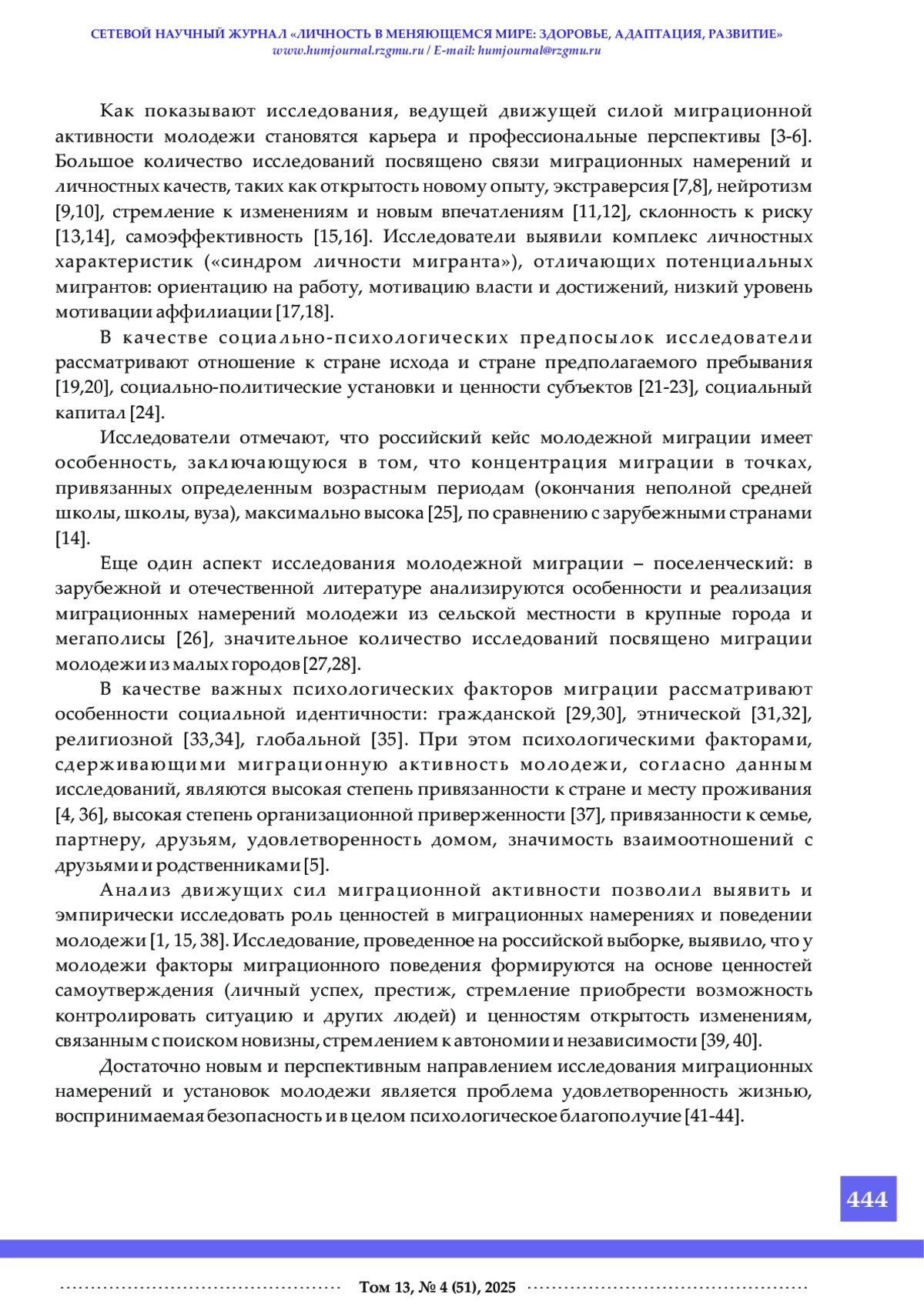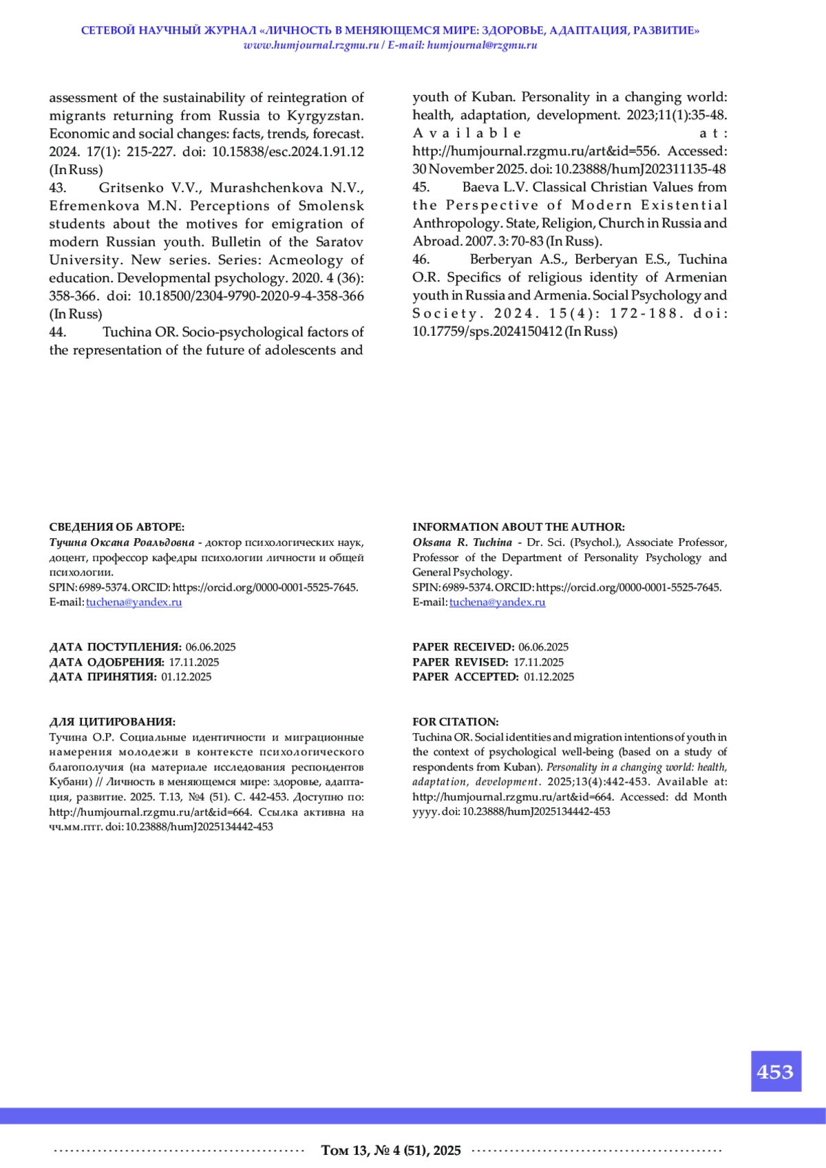 44. Tuchina OR. Socio-psychological factors of the representation of the future of adolescents and youth of Kuban. Personality in a changing world: health, adaptation, development. 2023;11(1):35-48. Available at: http://humjournal.rzgmu.ru/art&id=556. Accessed: 30 November 2025. DOI: 10.23888/humJ202311135-48