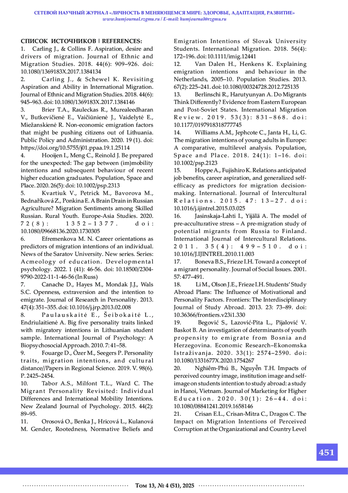 6. Efremenkova M. N. Career orientations as predictors of migration intentions of an individual. News of the Saratov University. New series. Series: Acmeology of education. Developmental psychology. 2022. 1 (41): 46-56. DOI: 10.18500/23049790-2022-11-1-46-56