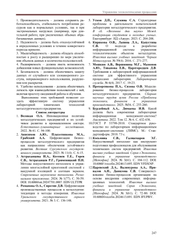 8. Прохоренкова П.А., Сизова О.В. Моделирование бизнес-процессов лаборатории металлургического предприятия. Сборник научных трудов вузов России “Проблемы экономики, финансов и управления производством”. 2025. №56. С. 255-260. EDN: OWEVQO