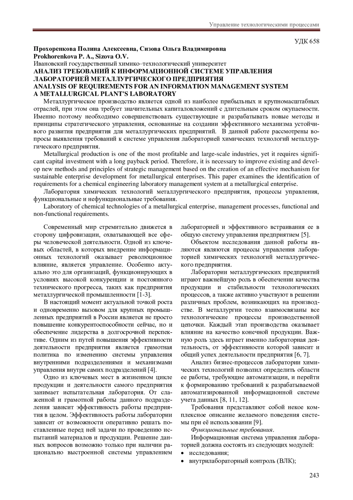 Металлургическое производство является одной из наиболее прибыльных и крупномасштабных отраслей, при этом она требует значительных капиталовложений с длительным сроком окупаемости. Именно поэтому необходимо совершенствовать существующие и разрабатывать новые методы и принципы стратегического управления, основанные на создании эффективного механизма устойчивого развития предприятия для металлургических предприятий. В данной работе рассмотрены вопросы выявления требований к системе управления лабораторией химических технологий металлургического предприятия.