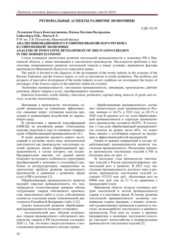 Статья посвящена диагностики развития текстильной промышленности в экономике РФ и Ивановской области, а также инновациям в текстильном производстве. Исследуются проблемы и перспективы инновационного развития текстильной отрасли в новых условиях, выявляются факторы преимуществ Ивановской области на отраслевом рынке.