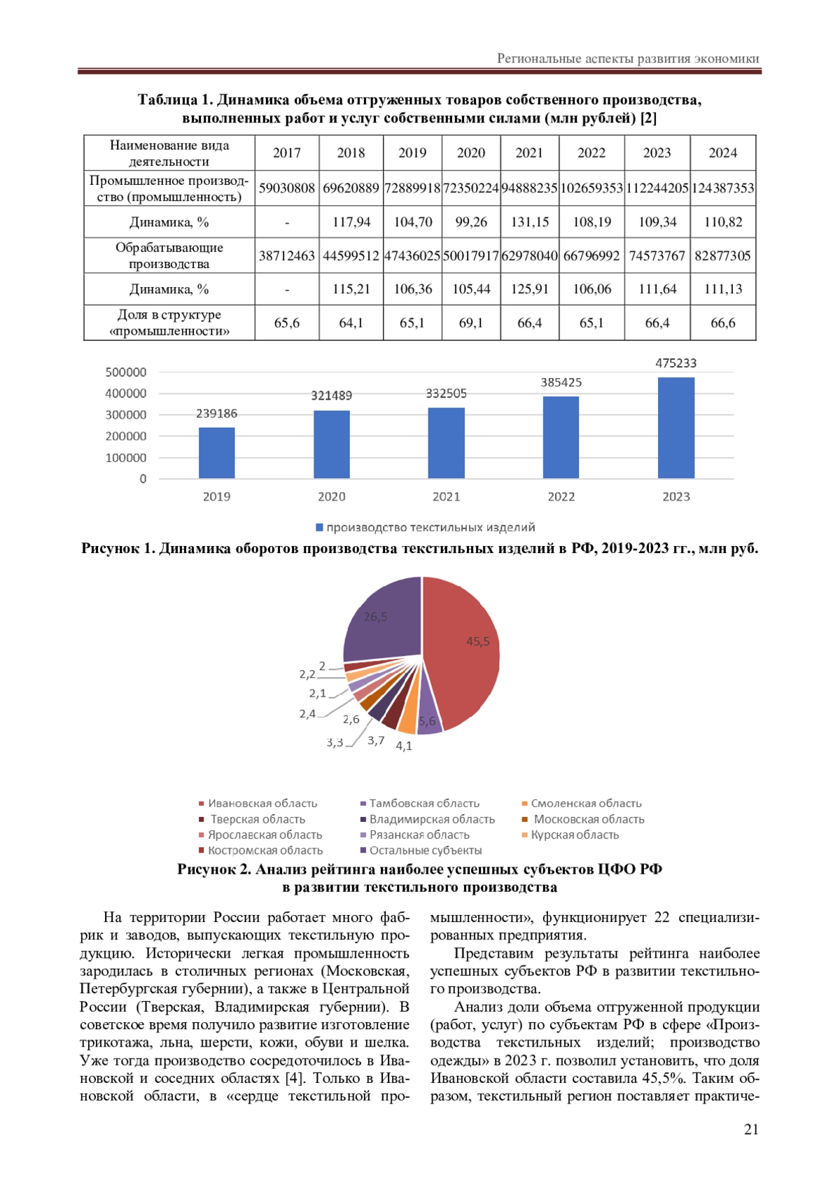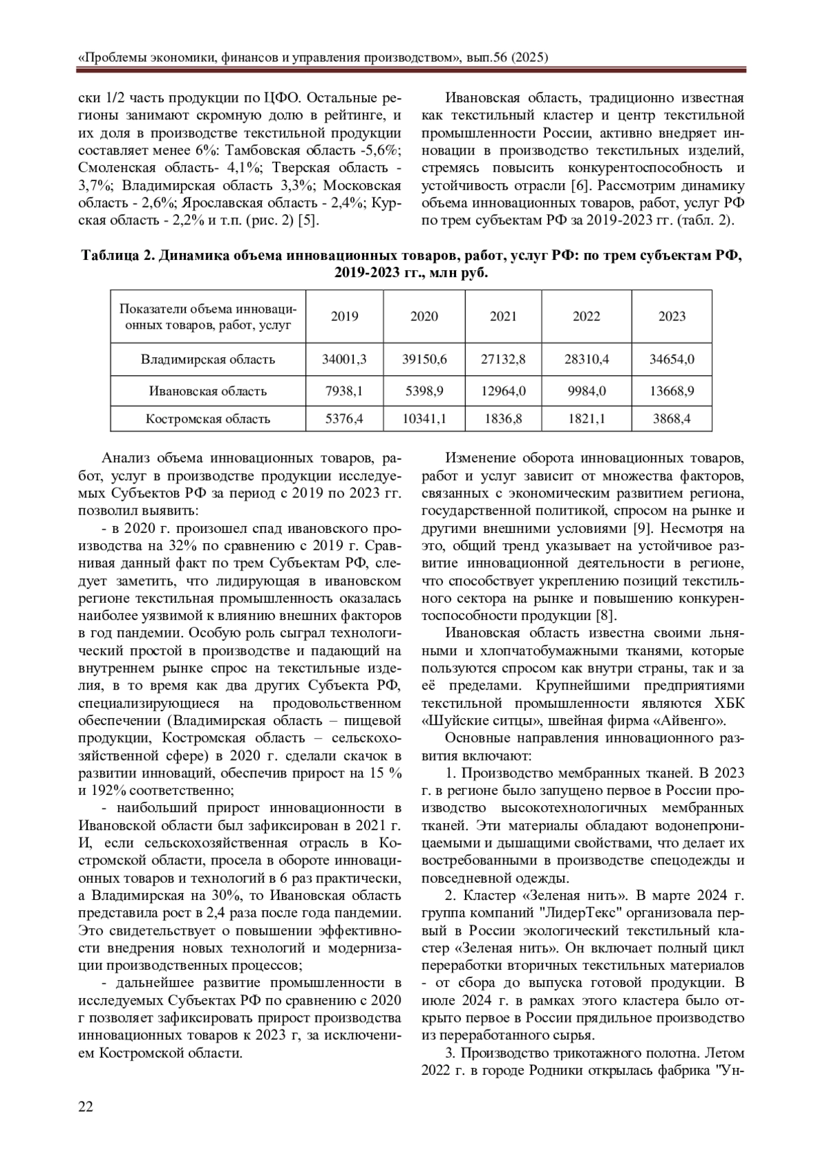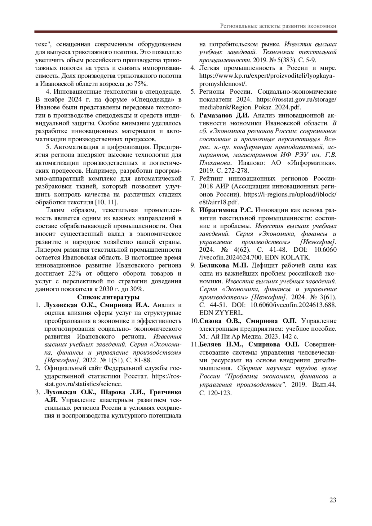 8. Ибрагимова Р.С. Инновации как основа развития текстильной промышленности: состояние и проблемы. Известия высших учебных заведений. Серия “Экономика, финансы и управление производством” [Ивэкофин]. 2024. № 4(62). С. 41-48. DOI: 10.6060/ivecofin.2024624.700 EDN: KOLATK