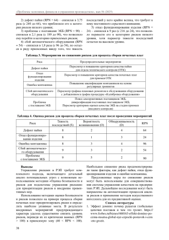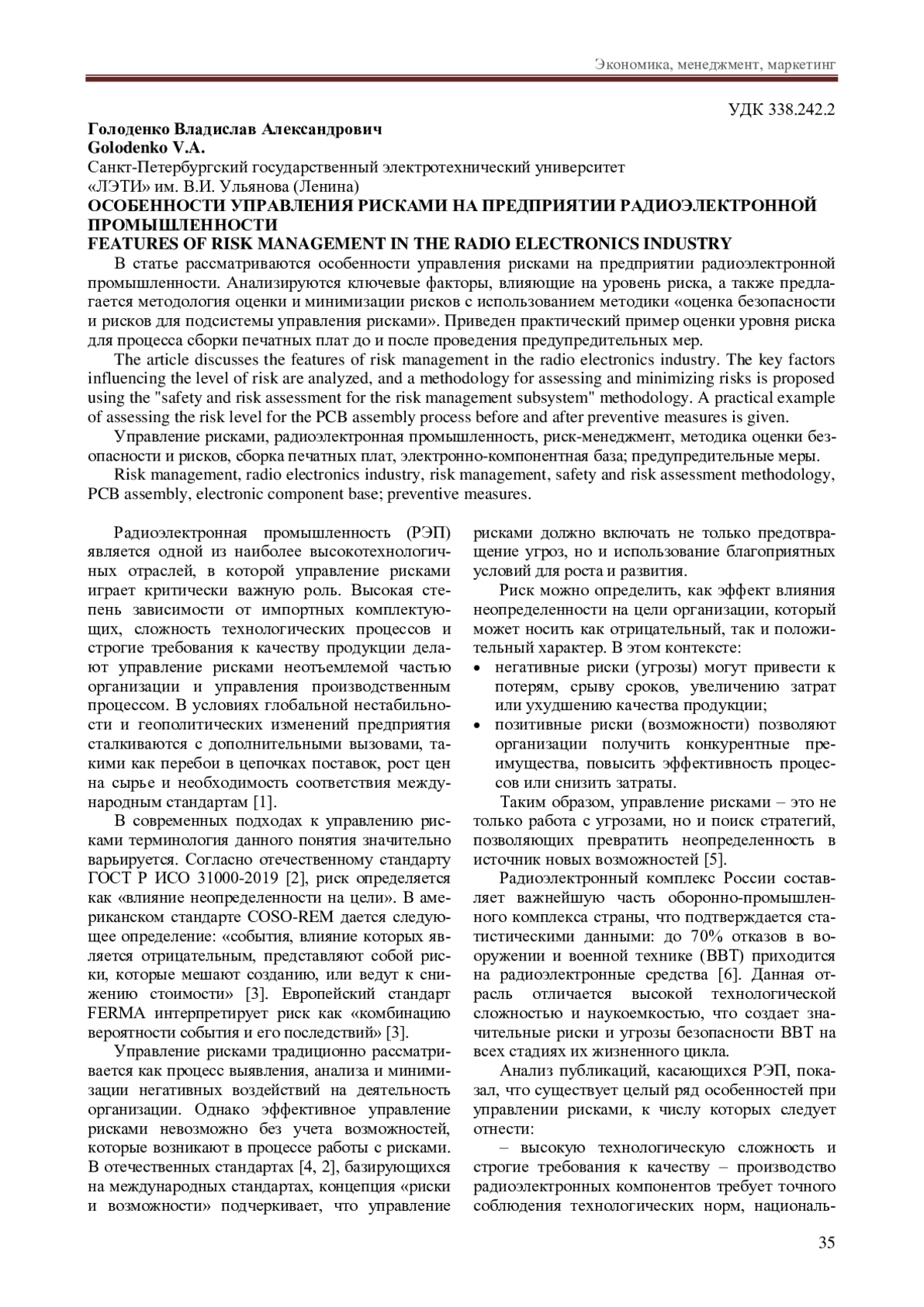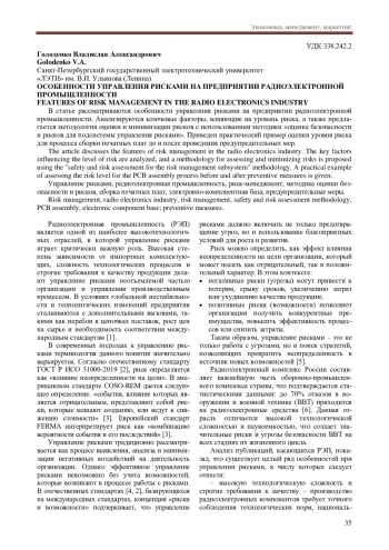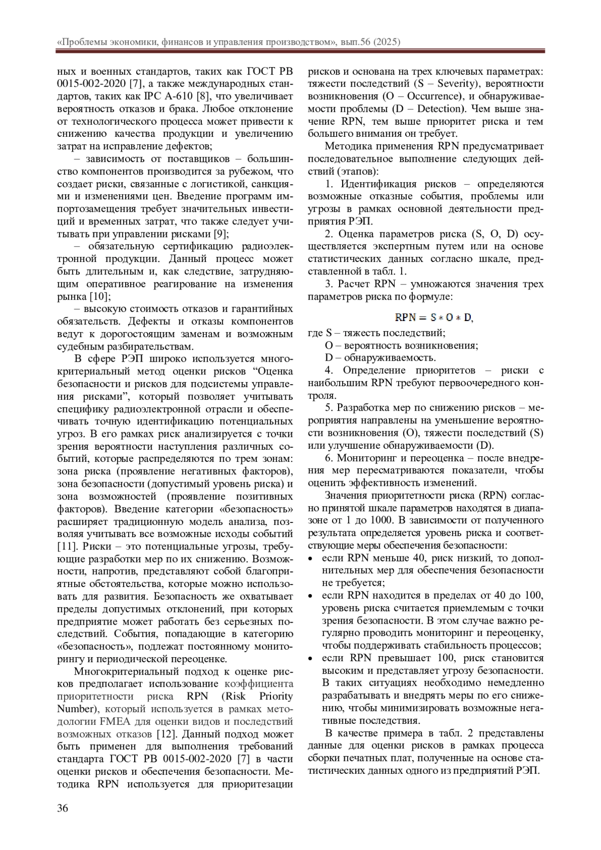 Радиоэлектронная промышленность (РЭП) является одной из наиболее высокотехнологичных отраслей, в которой управление рисками играет критически важную роль. Высокая степень зависимости от импортных комплектующих, сложность технологических процессов и строгие требования к качеству продукции делают управление рисками неотъемлемой частью организации и управления производственным процессом. В условиях глобальной нестабильности и геополитических изменений предприятия сталкиваются с дополнительными вызовами, такими как перебои в цепочках поставок, рост цен на сырье и необходимость соответствия международным стандартам [1].