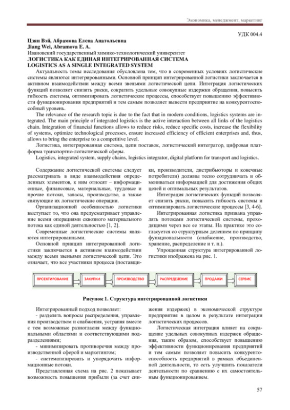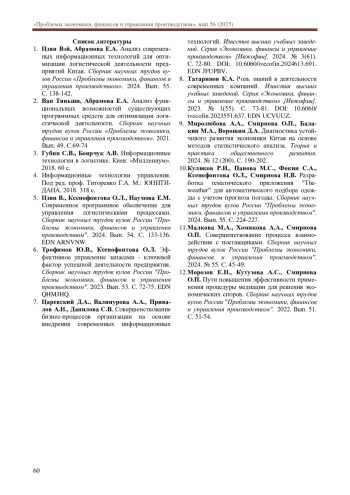 1. Цзян Вэй, Абрамова Е.А. Анализ современных информационных технологий для оптимизации логистической деятельности предприятий Китая. Сборник научных трудов вузов России “Проблемы экономики, финансов и управления производством”. 2024. Вып. 55. С. 138-142. EDN: GQUIKS