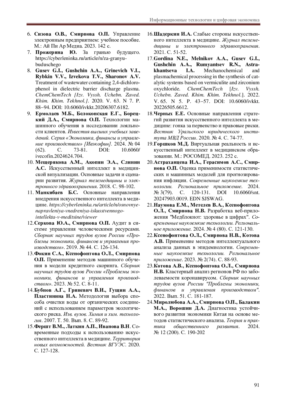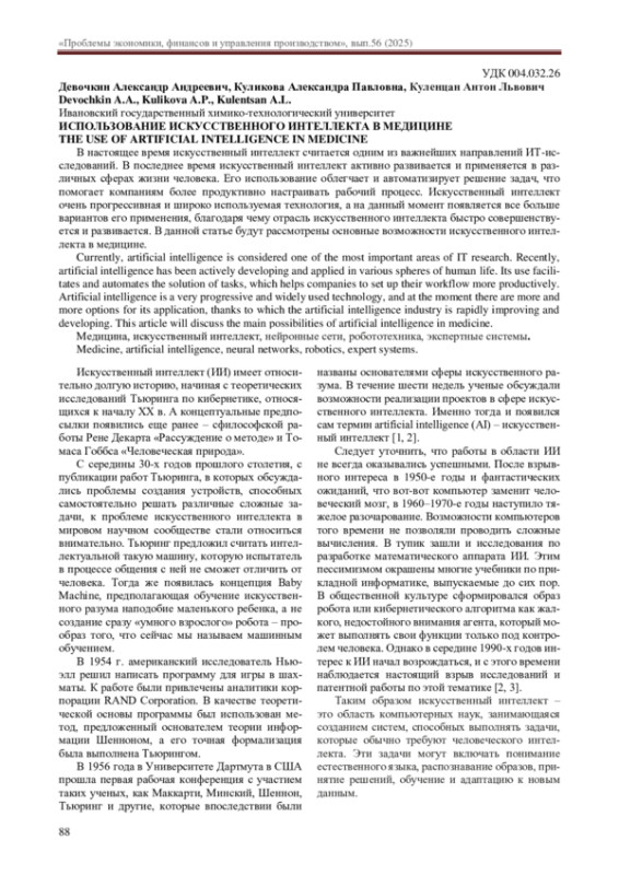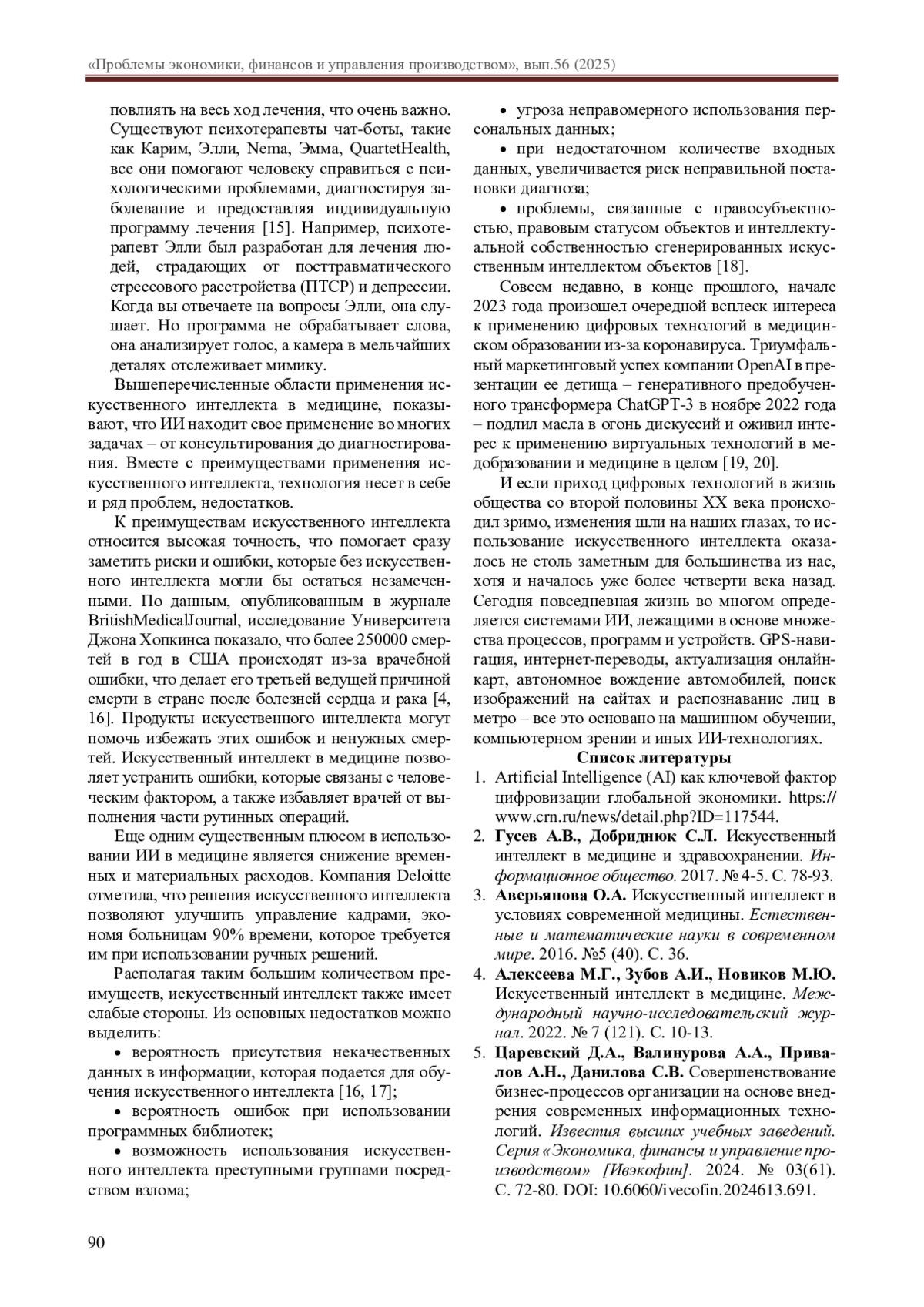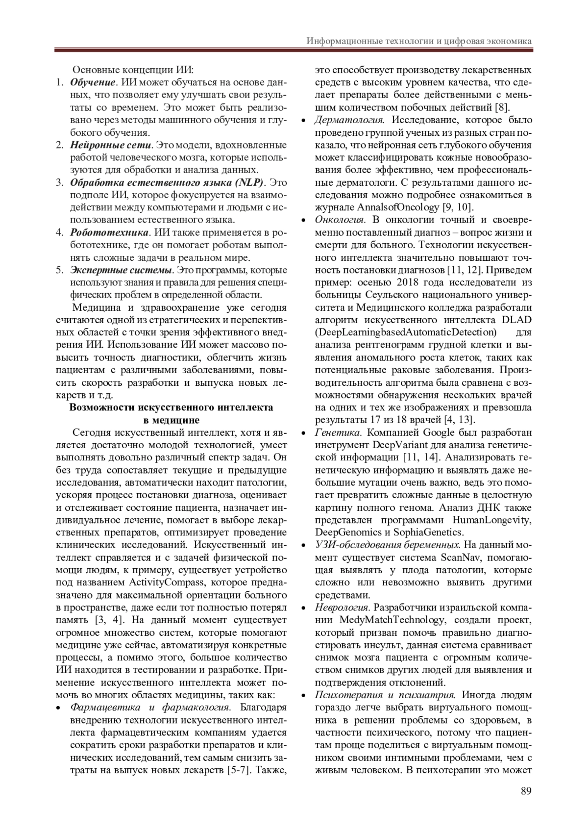 15. Фершт В.М., Латкин А.П., Иванова В.Н. Современные подходы к использованию искусственного интеллекта в медицине. Территория новых возможностей. Вестник ВГУЭС. 2020. С. 127-128.