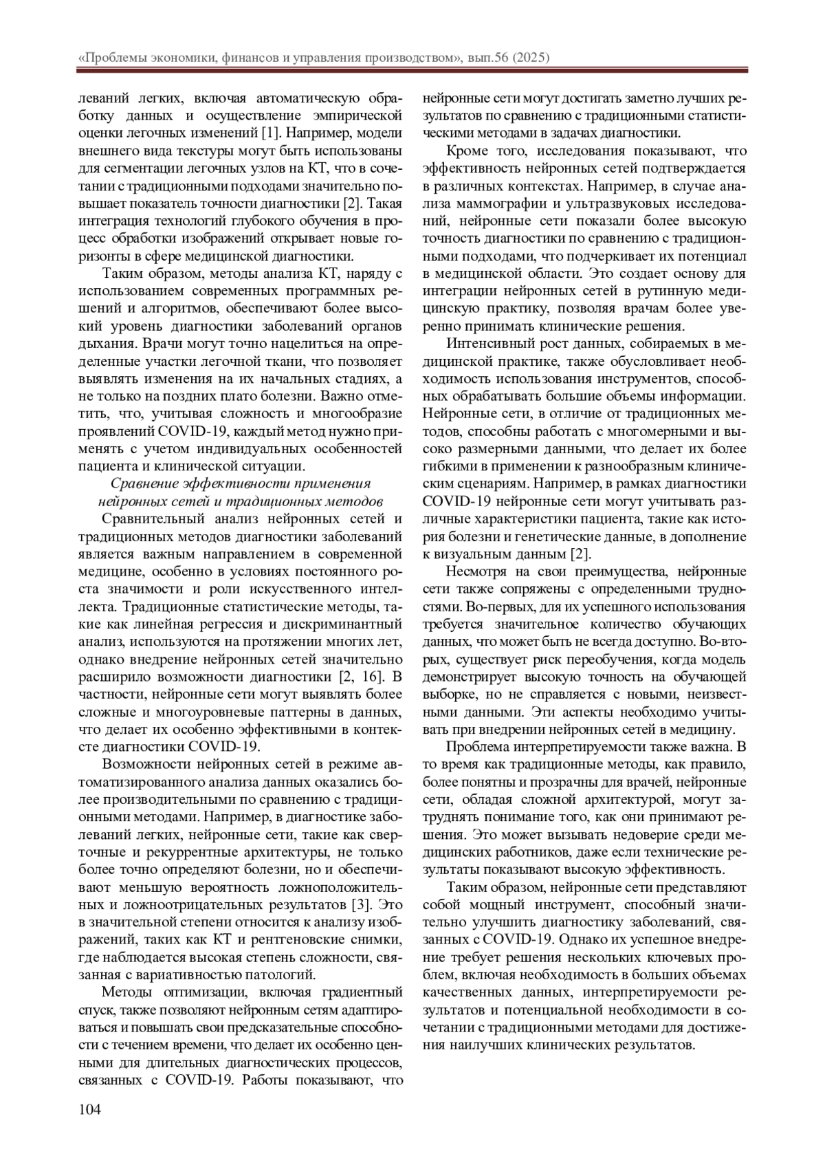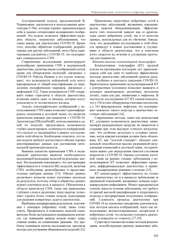 Пандемия COVID-19 создала серьезные вызовы для систем здравоохранения по всему миру, подчеркивая необходимость эффективных и быстрых методов диагностики. Являясь вирусным заболеванием, COVID-19 имеет широкий спектр клинических проявлений, что усложняет его выявление и необходимость применения специальных диагностических методов. Традиционные методы диагностики, такие как ПЦР-тестирование, имеют свои ограничения, например, сроки получения результата и возможность ложноположительных или ложноотрицательных результатов. В этом контексте использование нейронных сетей для анализа медицинских изображений, таких как рентгеновские и компьютерные томографические данные, может значительно улучшить качество диагностики [1].
