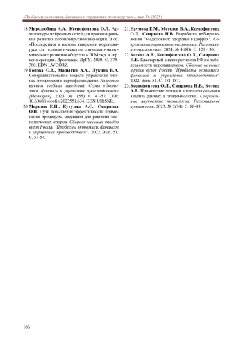 17. Ксенофонтова О.Л., Смирнова Н.В., Котова А.В. Применение методов интеллектуального анализа данных в эпидемиологии. Современные наукоемкие технологии. Региональное приложение. 2023. № 2(74). С. 88-93. DOI: 10.6060/snt.20237402.0009 EDN: CXXELZ