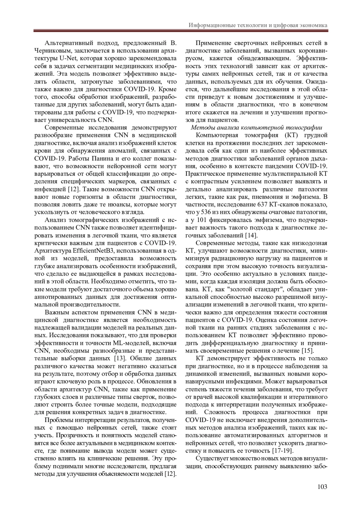 В последние годы мир столкнулся с беспрецедентной глобальной проблемой, вызванной пандемией коронавируса (COVID-19), которая оказала значительное влияние на здоровье населения, экономику и социальные структуры. В условиях стремительного распространения вируса и необходимости быстрой диагностики заболеваний, вызванных COVID-19, возникла необходимость в разработке и внедрении новых технологий, способных обеспечить эффективное выявление и мониторинг состояния пациентов. В этом контексте особое внимание привлекают методы, основанные на использовании нейронных сетей и глубокого обучения, которые демонстрируют высокую эффективность в анализе медицинских изображений, таких как компьютерная томография грудной клетки, в данной статье они и будут рассмотрены.