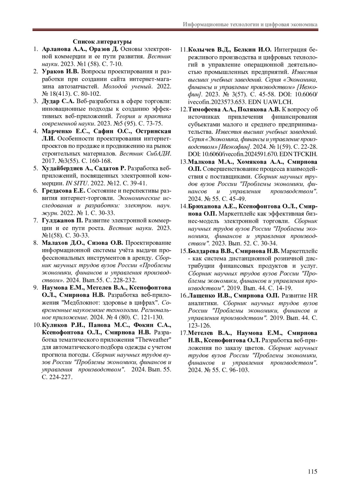 17. Метелев В.А., Наумова Е.М., Смирнова Н.В., Ксенофонтова О.Л. Разработка веб-приложения по заказу цветов. Сборник научных трудов вузов России “Проблемы экономики, финансов и управления производством”. 2024. № 55. С. 96-103. EDN: QMMAIT