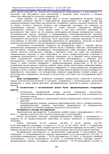 Актуальность. Систематические исследования профессиональных этических установок и поведения психологов-консультантов имеют большое значение для становления этической культуры психологической практики. Однако в России, несмотря на бурное развитие психологического консультирования, такие исследования до сих пор не проводились.