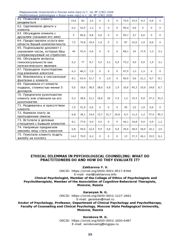 Результаты. Выявлено существенное расхождение между этическими убеждениями специалистов и их реальной практикой, особенно в сферах конфиденциальности, управления собственным дистрессом, неформальных форм взаимодействия с клиентами и границ компетентности. Обозначены «серые зоны» практики, где нет этического консенсуса среди профессионалов. Обнаружены статистически значимые гендерные различия: мужчины-психологи чаще вовлекаются в практики, ослабляющие профессиональные границы, и чаще сообщают о сексуальных фантазиях в отношении клиентов. Наличие профильного высшего образования не снижает общую частоту этических нарушений, а лишь меняет их профиль, что ставит под вопрос эффективность текущих моделей подготовки.