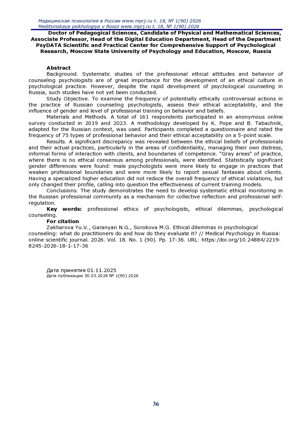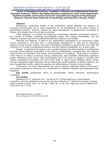 Выводы. Исследование демонстрирует необходимость развития систематического этического мониторинга в российском профессиональном сообществе как механизма коллективной рефлексии и профессиональной саморегуляции.
