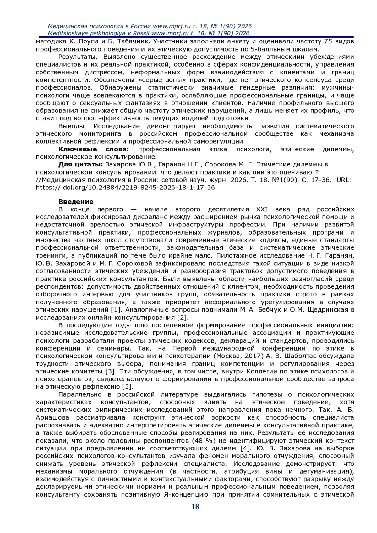 1. Гаранян Н.Г., Захарова Ю.В., Сорокова М.Г. Этические установки российских психологов-консультантов: область разногласий и потенциальных конфликтов. Консультативная психология и психотерапия. 2020; 28(1):87-112. DOI: 10.17759/cpp.2020280106