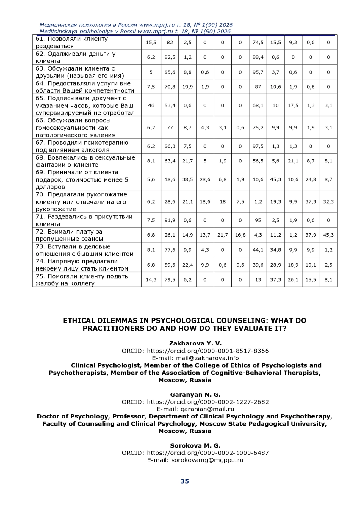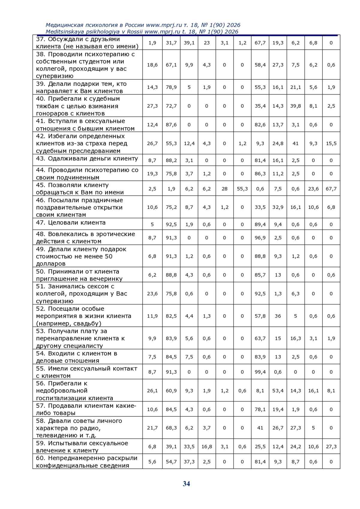 Материалы и методы. В анонимном онлайн опросе, проводившемся в 2019 и 2023 г. г., принял участие 161 респондент. Использовалась адаптированная для российских условий методика К. Поупа и Б. Табачник. Участники заполняли анкету и оценивали частоту 75 видов профессионального поведения и их этическую допустимость по 5-балльным шкалам.