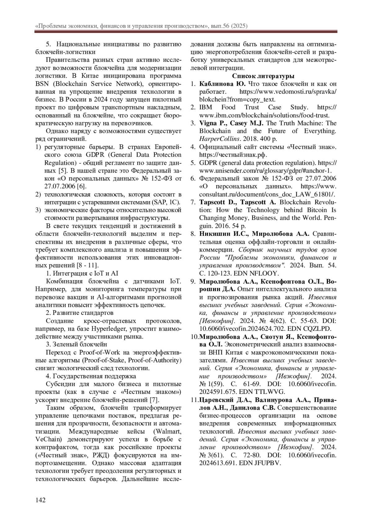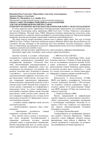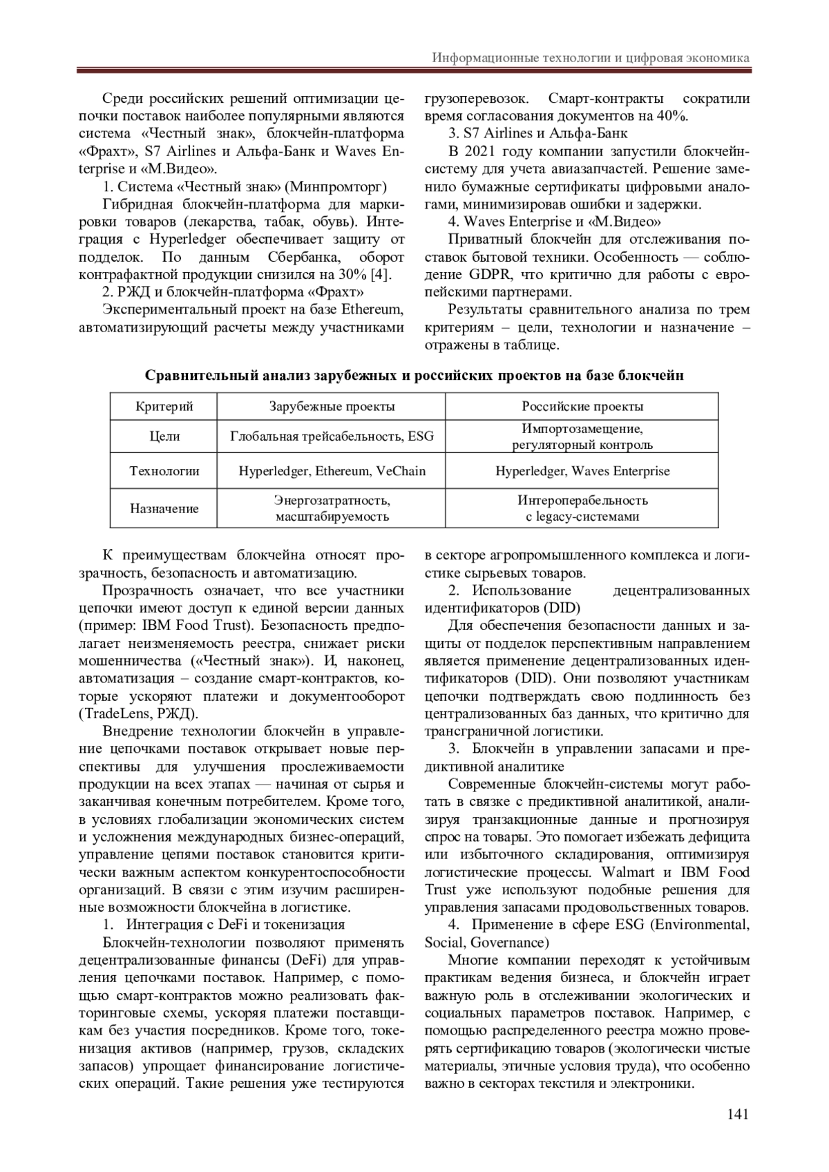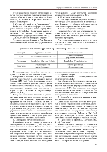 В статье проведен анализ современных блокчейн-решений, применяемых для оптимизации цепочек поставок. Рассмотрены кейсы зарубежных (IBM Food Trust, VeChain, TradeLens) и российских проектов (Сбербанк, «Честный знак», РЖД). Выявлены ключевые преимущества технологии: повышение прозрачности, снижение рисков контрафакта и автоматизация процессов. Определены барьеры внедрения, включая регуляторные ограничения и проблемы масштабируемости.
