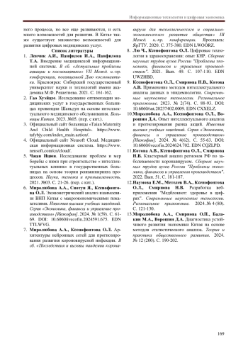 9. Ксенофонтова О.Л., Смирнова Н.В., Котова А.В. Применение методов интеллектуального анализа данных в эпидемиологии. Современные наукоемкие технологии. Региональное приложение. 2023. № 2(74). С. 88-93. DOI: 10.6060/snt.20237402.0009 EDN: CXXELZ
