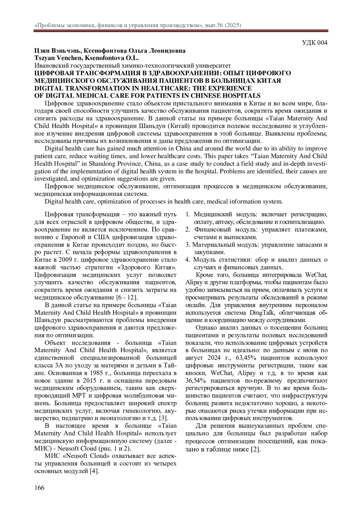 Цифровое здравоохранение стало объектом пристального внимания в Китае и во всем мире, благодаря своей способности улучшить качество обслуживания пациентов, сократить время ожидания и снизить расходы на здравоохранение. В данной статье на примере больницы «Taian Maternity And Child Health Hospital» в провинции Шаньдун (Китай) проводится полевое исследование и углубленное изучение внедрения цифровой системы здравоохранения в этой больнице. Выявлены проблемы, исследованы причины их возникновения и даны предложения по оптимизации.