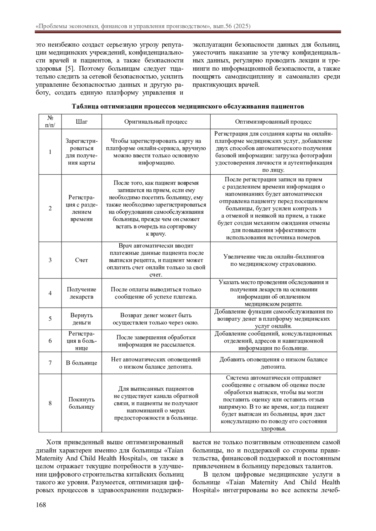 5. Чжан Ицюн. Исследование проблем и мер борьбы с ними при строительстве “интеллектуальных клиник” в государственных больницах на основе теории реинжиниринга процессов. Наука, техника и промышленность. 2021. №03. C. 21-26. (пер. с кит.).
