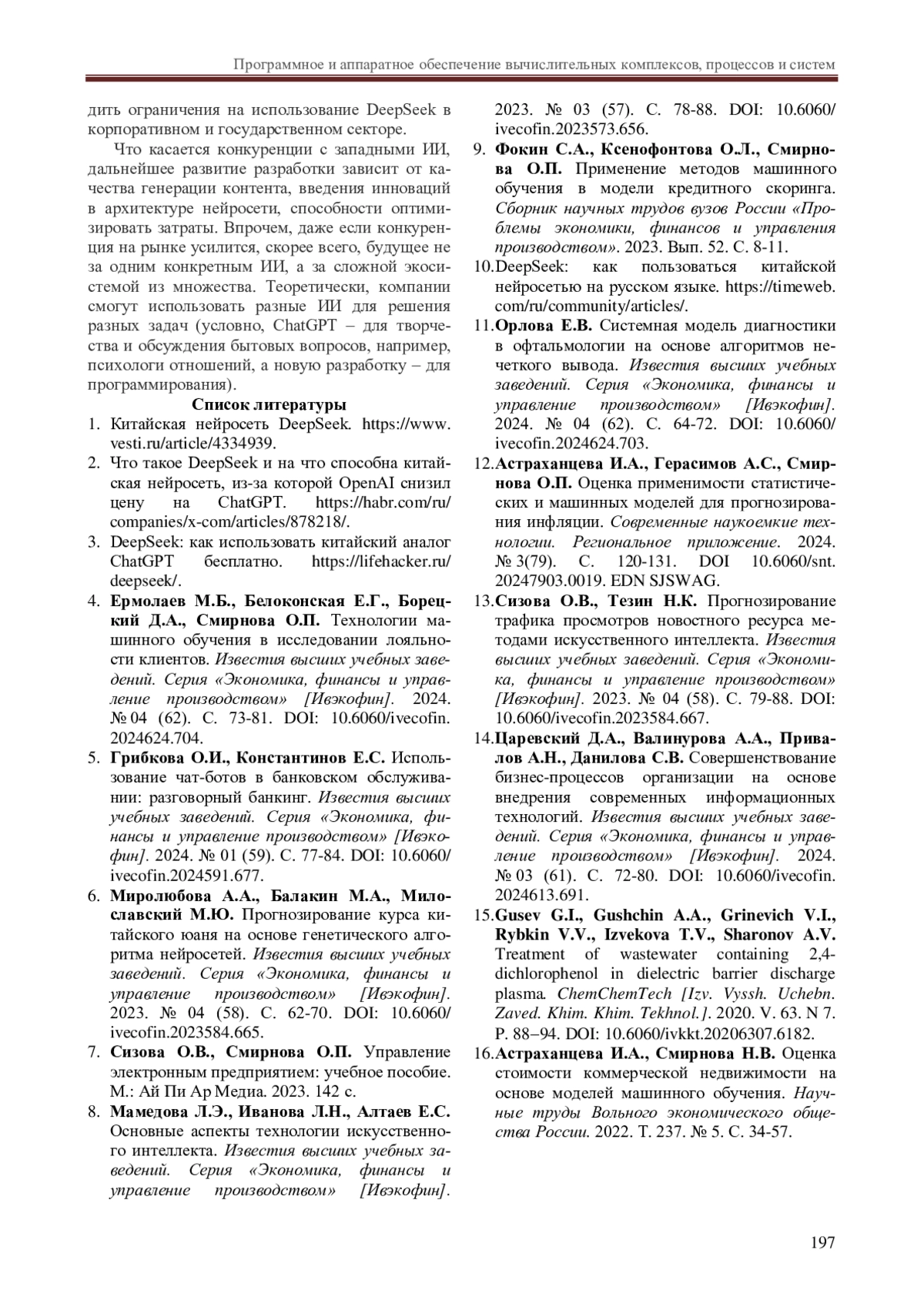 4. Ермолаев М.Б., Белоконская Е.Г., Борецкий Д.А., Смирнова О.П. Технологии машинного обучения в исследовании лояльности клиентов. Известия высших учебных заведений. Серия “Экономика, финансы и управление производством” [Ивэкофин]. 2024. № 04 (62). С. 73-81. DOI: 10.6060/ivecofin.2024624.704 EDN: NOHACV