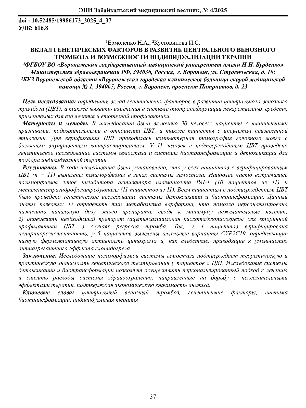 Заключение. Исследование полиморфизмов системы гемостаза подтверждает теоретическую и практическую значимость генетического тестирования у пациентов с ЦВТ. Исследование системы детоксикации и биотрансформации позволяет осуществить персонализированный подход к лечению и снизить расходы системы здравоохранения, направленные на борьбу с нежелательными эффектами терапии, подтверждая экономическую значимость анализа.