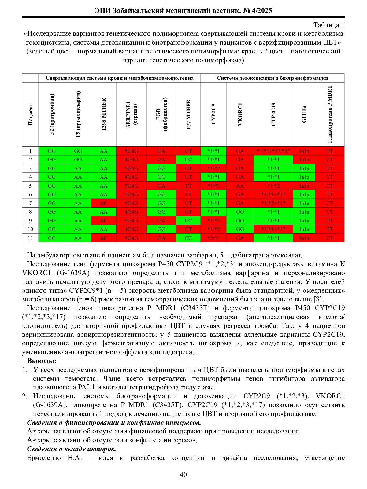 Цель исследования: определить вклад генетических факторов в развитие центрального венозного тромбоза (ЦВТ), а также выявить изменения в системе биотрансформации лекарственных средств, применяемых для его лечения и вторичной профилактики.