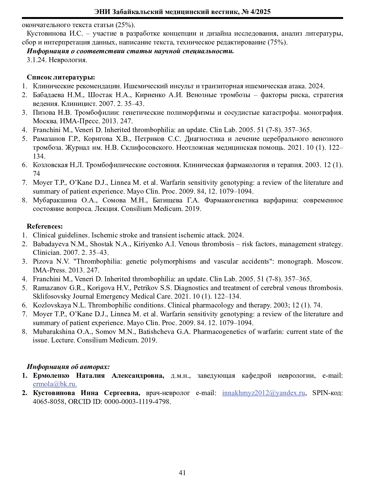5. Рамазанов Г.Р., Коригова Х.В., Петриков С.С. Диагностика и лечение церебрального венозного тромбоза. Журнал им. Н.В. Склифосовского. Неотложная медицинская помощь. 2021. 10 (1). 122134.