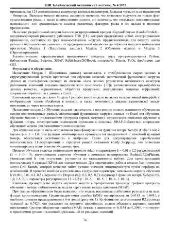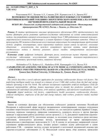 18. Решетникова Ю.С., Косачев Д.В., Каткова А.Л. и др. КардиоПрогноз (CardioPredict) -кардиоваскулярный рискометр работников топливно-энергетического комплекса (ТЭК): Свидетельство о государственной регистрации программы для ЭВМ № 2025665537 (18.06.2025).