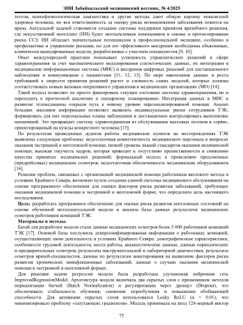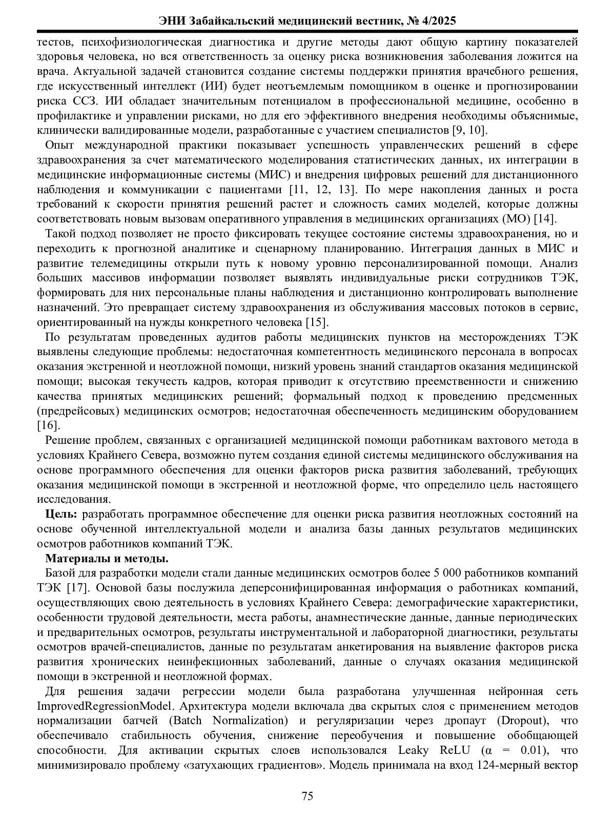 Одним из ключевых факторов для обеспечения стабильного развития экономики Российской Федерации в нефтегазовой сфере является своевременное мониторирование здоровья сотрудников топливно-энергетического комплекса (ТЭК), особенно тех, кто находится в районах Крайнего Севера, поскольку перепады температур, природная освещенность, влажность воздуха и другие факторы приводят к нарушениям работы различных систем органов [1, 2, 3]. Для раннего выявления сердечно-сосудистых заболеваний (ССЗ), увеличение которых за последние годы отмечается среди вахтовых работников, используются различные методы, применяемые во время предварительных, периодических и внеочередных медосмотров [4, 5, 6]. К одному из актуальных направлений относят оценивание профессионального риска, которое решает главную задачу работодателей и самих работников ТЭК, – снижение частоты случаев экстренной и неотложной медицинской помощи при сердечно-сосудистых заболеваниях [7, 8].