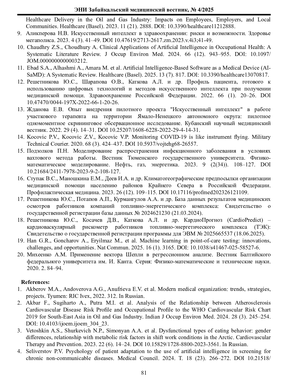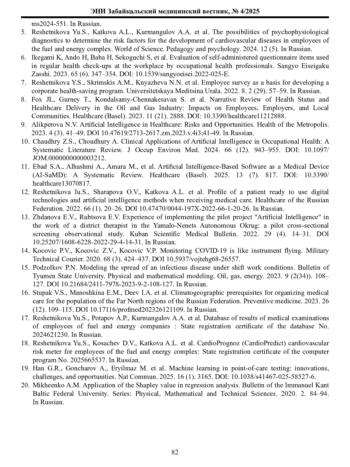 5. Решетникова Ю.С., Каткова А.Л., Курмангулов А.А. и др. Возможности психофизиологической диагностики для определения факторов риска развития сердечно-сосудистых заболеваний у работников топливно-энергетического комплекса. Мир науки. Педагогика и психология. 2024. 12 (5).