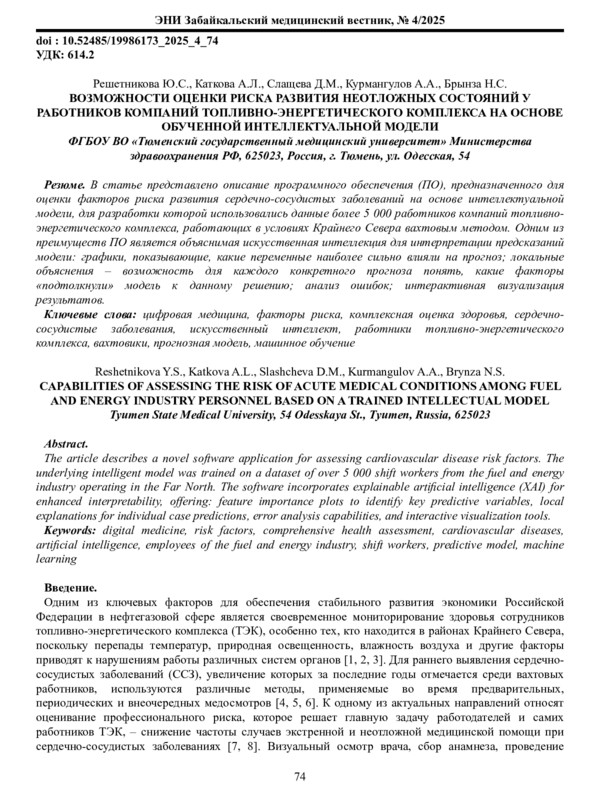 В статье представлено описание программного обеспечения (ПО), предназначенного для оценки факторов риска развития сердечно-сосудистых заболеваний на основе интеллектуальной модели, для разработки которой использовались данные более 5 000 работников компаний топливно-энергетического комплекса, работающих в условиях Крайнего Севера вахтовым методом. Одним из преимуществ ПО является объяснимая искусственная интеллекция для интерпретации предсказаний модели: графики, показывающие, какие переменные наиболее сильно влияли на прогноз; локальные объяснения – возможность для каждого конкретного прогноза понять, какие факторы «подтолкнули» модель к данному решению; анализ ошибок; интерактивная визуализация результатов.