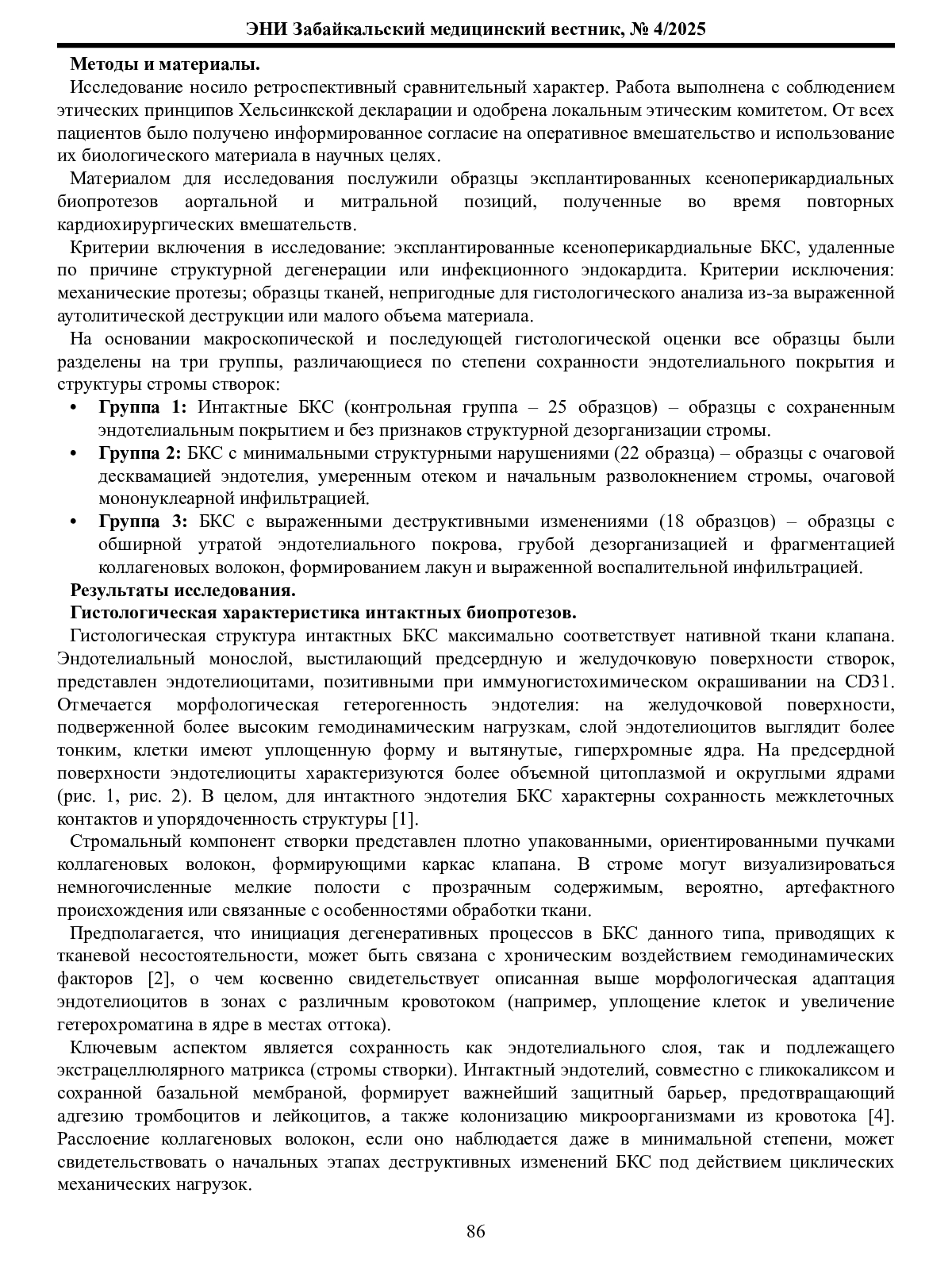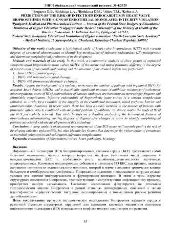 Инфекционный эндокардит (ИЭ) биопротезированных клапанов сердца (БКС) представляет собой серьезное осложнение, частота которого возрастает на фоне увеличения числа пациентов с имплантированными БКС и глобального роста антибиотикорезистентности патогенных микроорганизмов. Ключевым инициирующим событием в патогенезе ИЭ БКС, как правило, является нарушение целостности эндотелиального монослоя, который в норме выполняет критически важные барьерную и тромборезистентную функции. Повреждение эндотелия и подлежащего матрикса создает условия для адгезии микроорганизмов и формирования вегетаций. В связи с этим, изучение структурных изменений в биопротезах, предшествующих и сопутствующих инфекционному процессу, приобретает особую актуальность. Настоящее исследование фокусируется на детальном гистологическом анализе биопротезов с разной степенью дегенеративных изменений с целью идентификации морфологических паттернов, ассоциированных с повышенным риском развития данной патологии.
