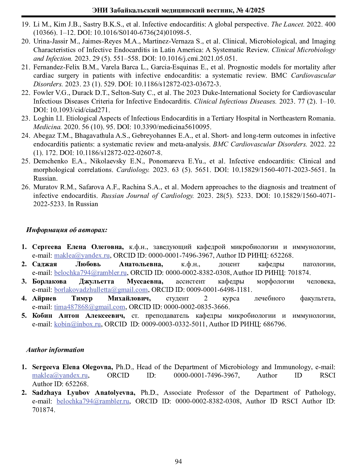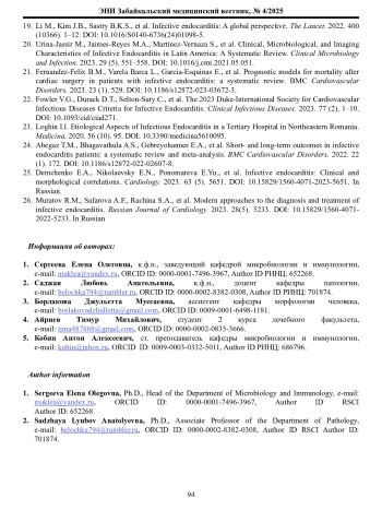 25. Демченко Е.А., Николаевский Е.Н., Пономарева Е.Ю. и соавт. Инфекционный эндокардит: клинико-морфологические параллели. Кардиология. 2023. 63. 5. 5651. DOI: 10.15829/1560-40712023-5651