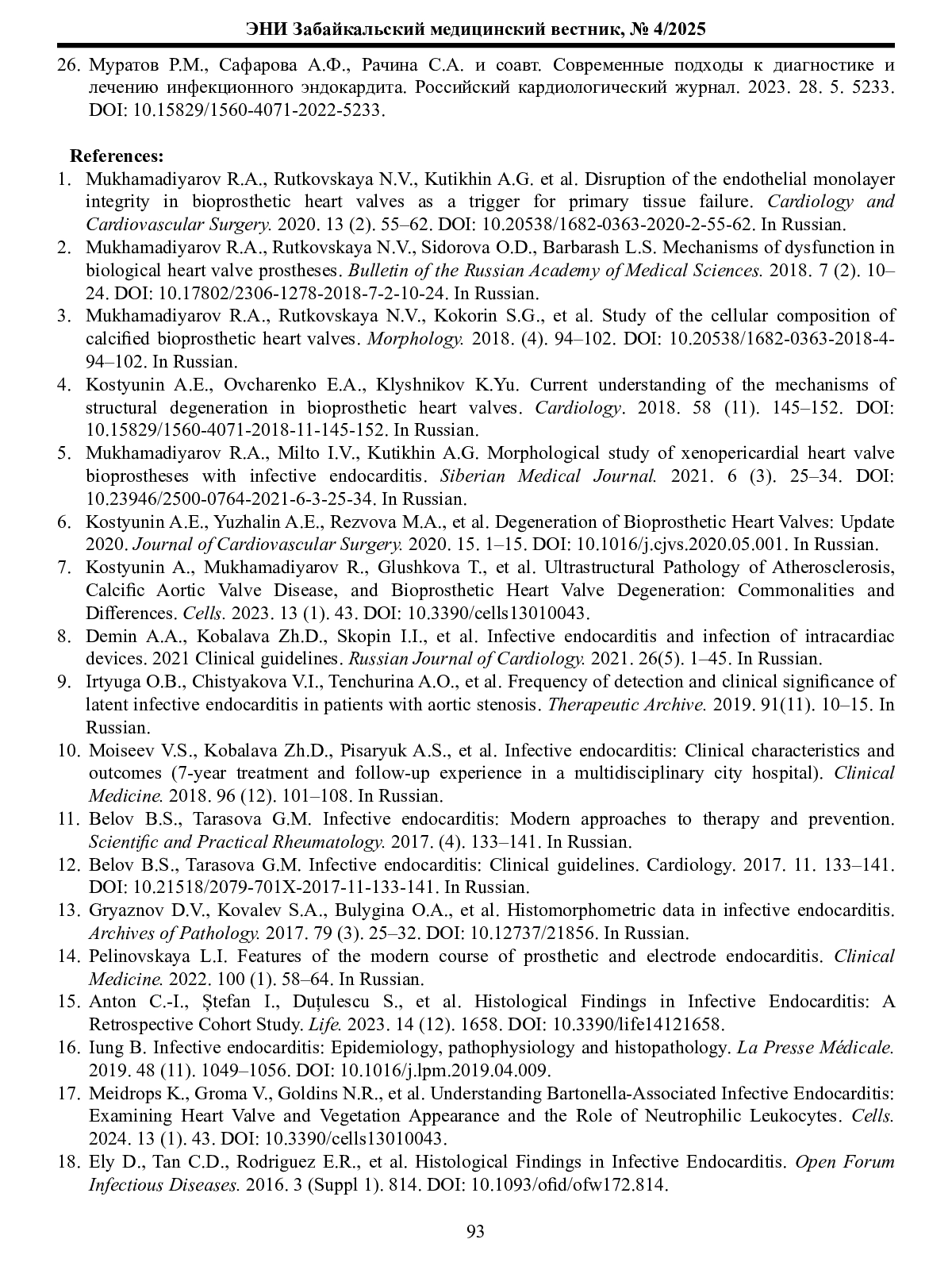 1. Мухамадияров Р.А., Рутковская Н.В., Кутихин А.Г. и соавт. Нарушение целостности эндотелиального монослоя биопротезов клапанов сердца как триггер развития первичной тканевой несостоятельности. Кардиология и сердечно-сосудистая хирургия. 2020. 13. 2. 55-62. DOI: 10.20538/1682-0363-2020-2-55-62
