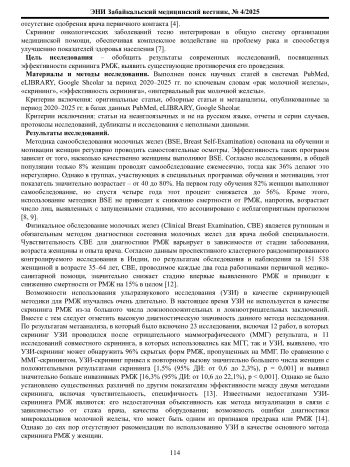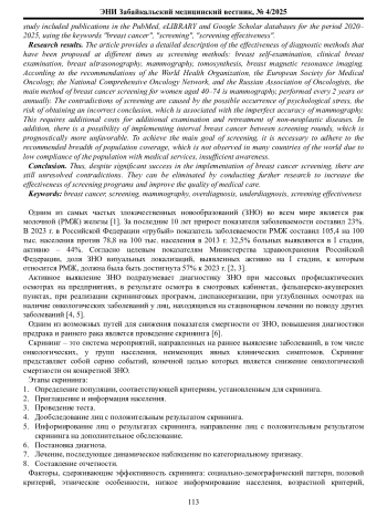 Материалы и методы. Проведен систематический обзор оригинальных исследований и обзоров, опубликованных в базах данных PubMed, eLIBRARY и Google Scholar за период 2020–2025 гг., по ключевым словам «рак молочной железы», «скрининг», «эффективность скрининга».