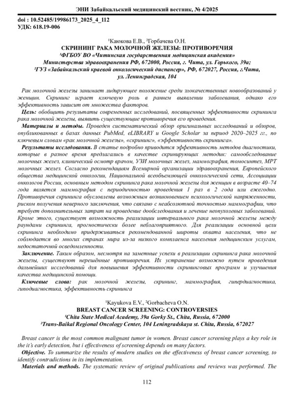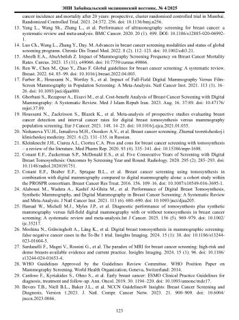 14. Luo Ch., Wang L., Zhang Y., Day. M. Advances in breast cancer screening modalities and status of global screening programs. Chronic Dis Transl Med. 2022. 8 (2). 112-123. DOI: 10.1002/cdt3.21 EDN: APNYFU