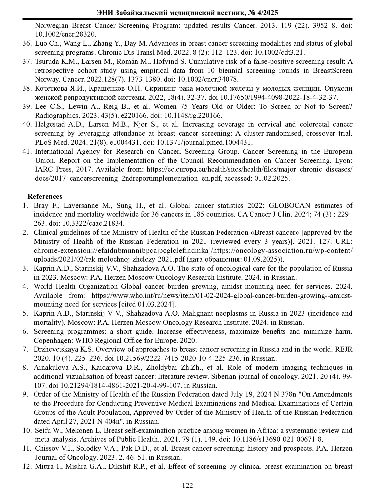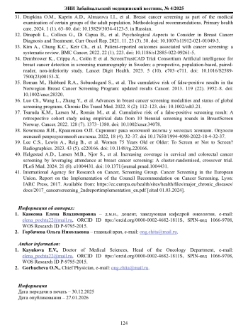 37. Tsuruda K.M., Larsen M., Roman M., Hofvind S. Cumulative risk of a false-positive screening result: A retrospective cohort study using empirical data from 10 biennial screening rounds in BreastScreen Norway. Cancer. 2022.128(7). 1373-1380. DOI: 10.1002/cncr.34078