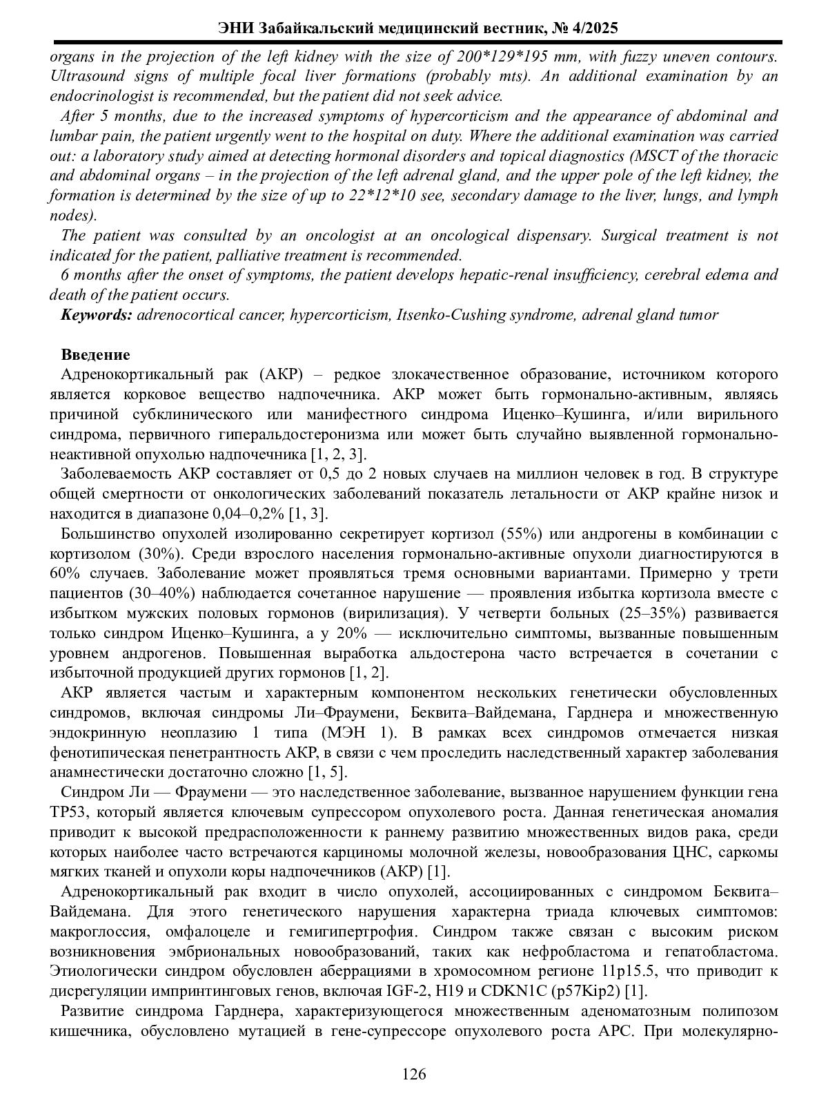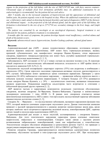 В данной статье приведено описание клинического случая гормонально - активного адренокортикального рака левого надпочечника у женщины молодого возраста. У пациентки отмечались симптомы гиперкортицизма (диспластическое ожирение, стрии синюшно-багрового цвета, артериальная гипертензия, сахарный диабет, аменорея, гирсутизм). При обследовании на амбулаторном этапе выявлен повышенный уровень кортизола суточной мочи >100 мкг/сутки, на УЗИ органов брюшной полости в проекции левой почки – образование размерами 200*129*195 мм с нечеткими неровными контурами. Ультразвуковые признаки множественных очаговых образований печени (вероятно mts). Рекомендовано дообследование у врача-эндокринолога, но пациентка за консультацией не обратилась. Через 5 месяцев в связи с усилением симптомов гиперкортицизма и появлением болей в животе и поясничной области, пациентка обратилась в экстренном порядке в дежурный стационар. Где проведено дообследование: лабораторное исследование, направленное на выявление гормональных нарушений и топическая диагностика (МСКТ органов грудной и брюшной полости- в проекции левого надпочечника и верхнего полюса левой почки определяется образование размерами до 22*12*10 см, вторичное поражение печени, легких, лимфатических узлов).