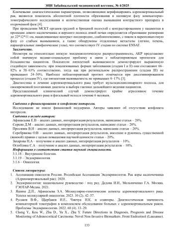 6. Селиванова Л.С., Рослякова А.А., Коваленко Ю.А., и соавторы. Современные критерии диагностики адренокортикального рака. Архив патологии. 2019. 81 (3). 66-73.