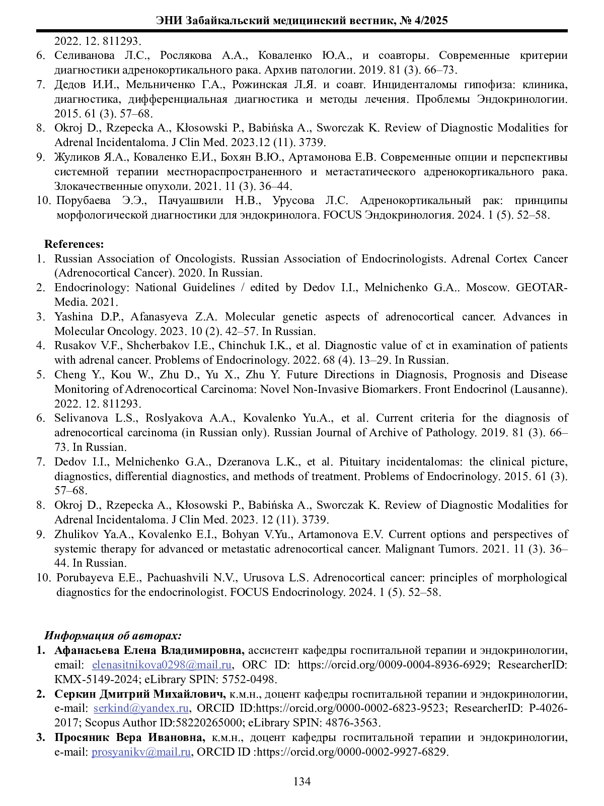 3. Яшина Д.П., Афанасьева З.А. Молекулярно-генетические аспекты адренокортикального рака. Успехи молекулярной онкологии. 2023. 10 (2). 42-57.