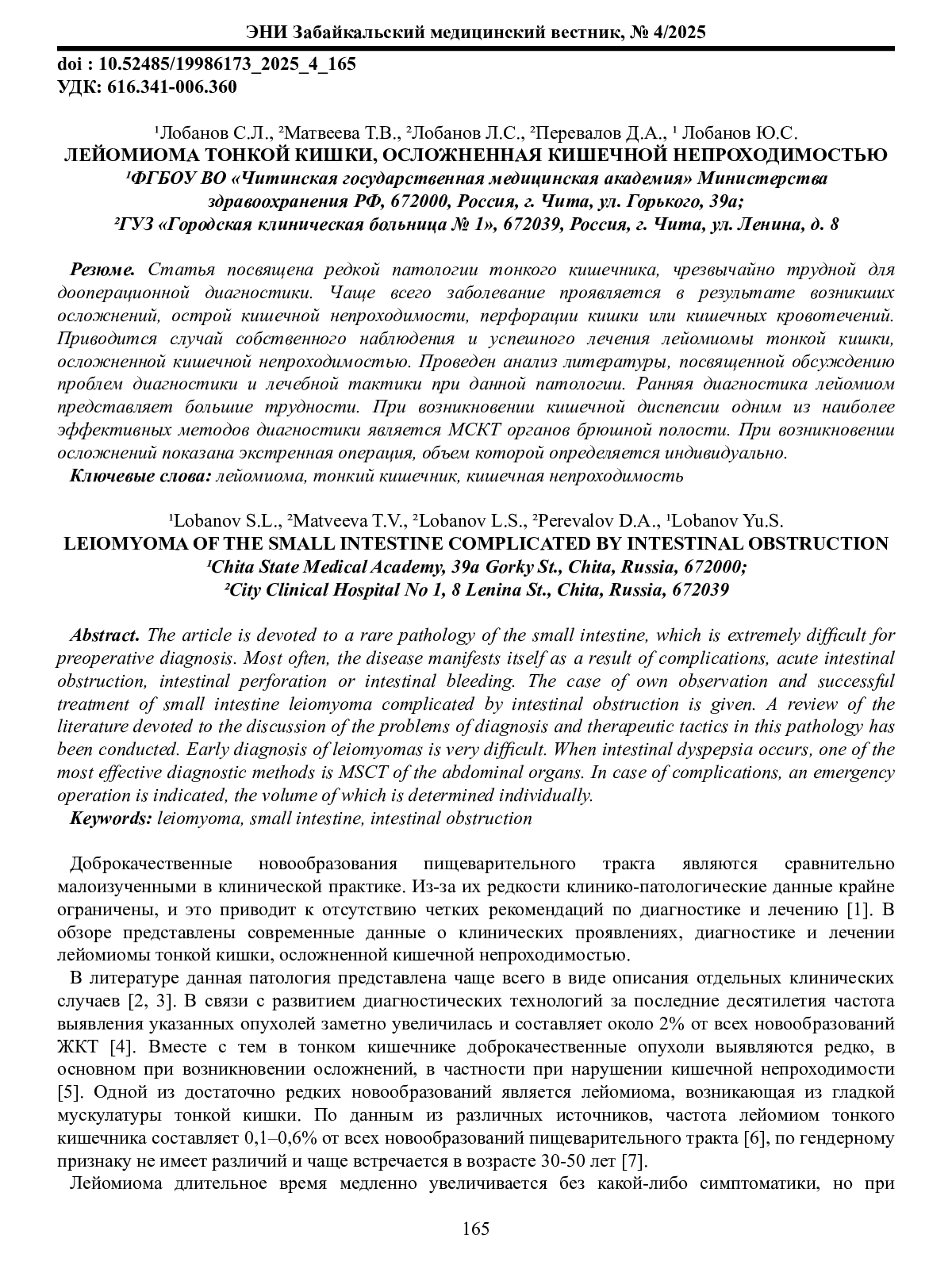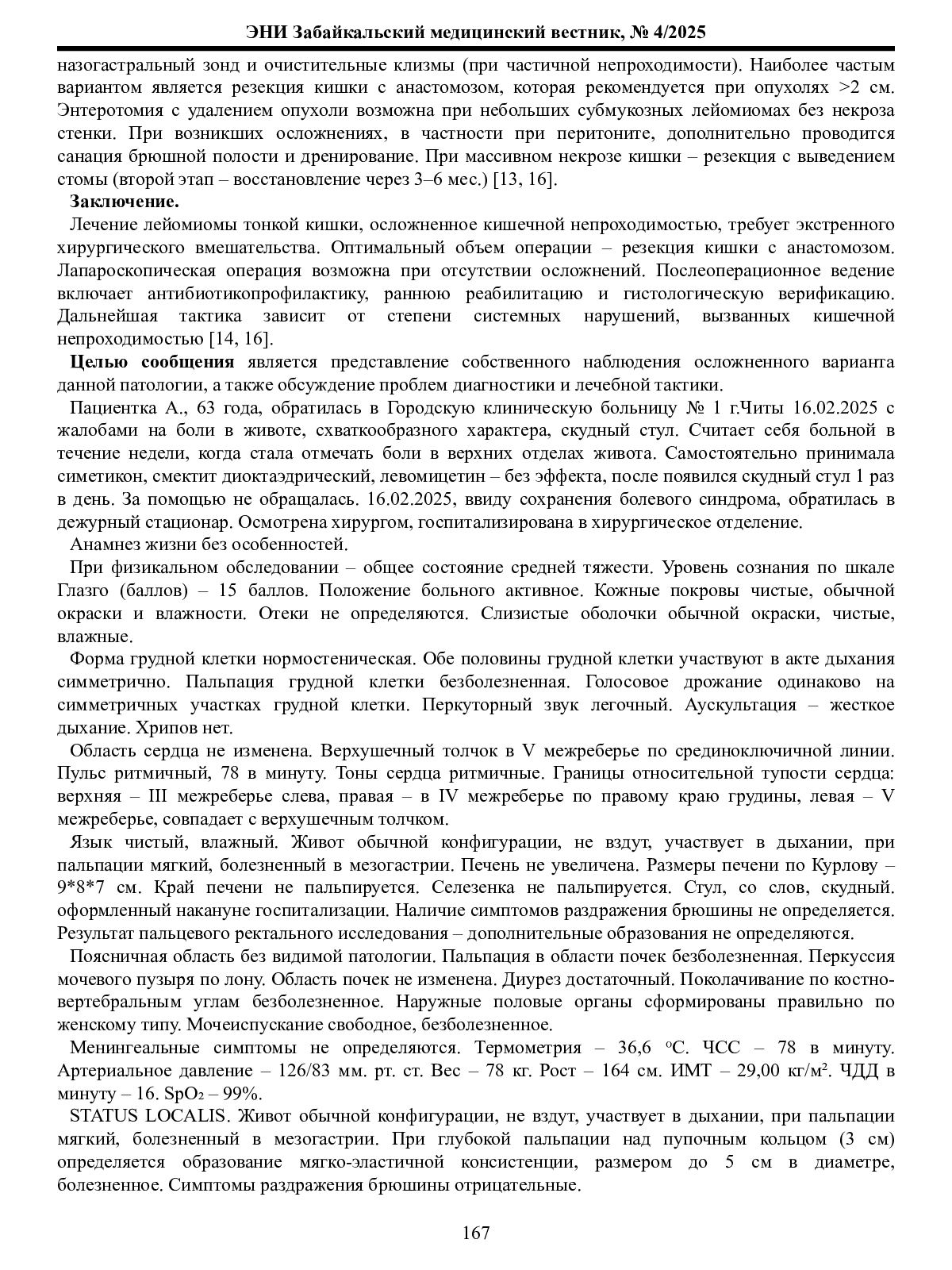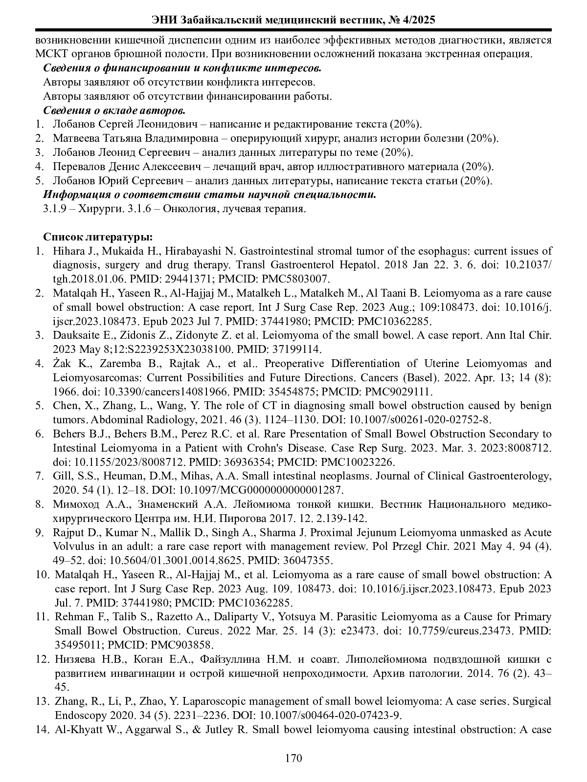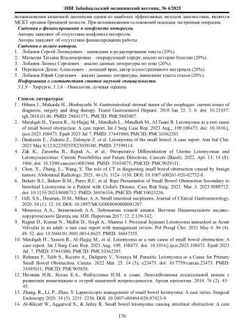 14. Al-Khyatt W., Aggarwal S., & Jutley R. Small bowel leiomyoma causing intestinal obstruction: A case report and literature review.International Journal of Surgery Case Reports. 2017. 31. 200-203. DOI: 10.1016/j.ijscr.2017.01.033