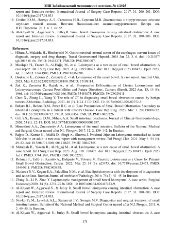16. Al-Khyatt W., Aggarwal S., Jutley,R. Small bowel leiomyoma causing intestinal obstruction: A case report and literature review.International Journal of Surgery Case Reports. 2017. 31. 200-203. DOI: 10.1016/j.ijscr.2017.01.033