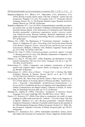 5. Богданова-Бегларян Н.В., Цуй Лили. Грамматическая специфика повседневной русской речи: на стыке конструкции и коллокации // Русская грамматика: структурная организация языка и процессы языкового функционирования. М.: Ленанд, 2019. С. 466-475.