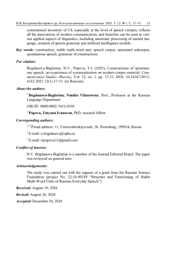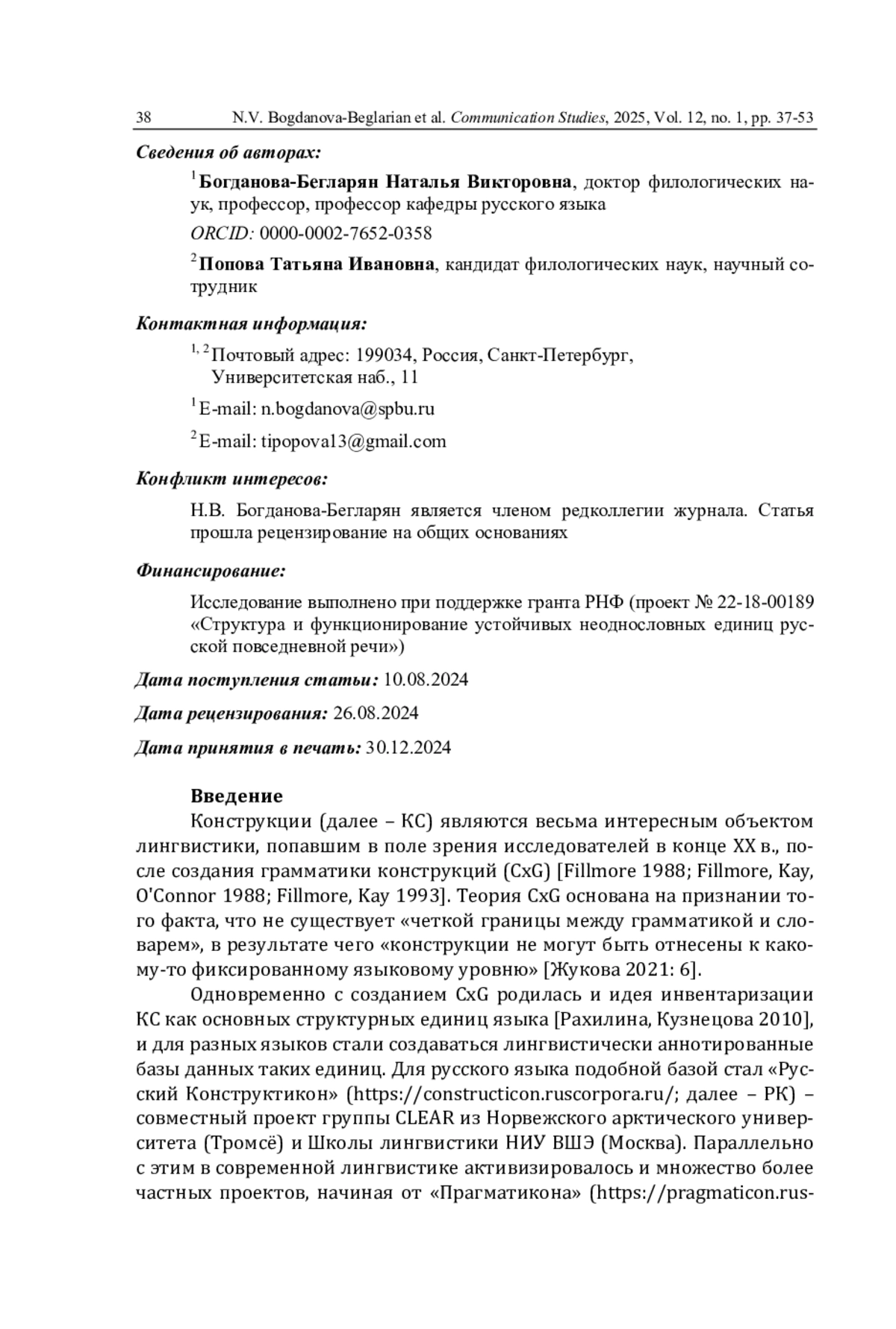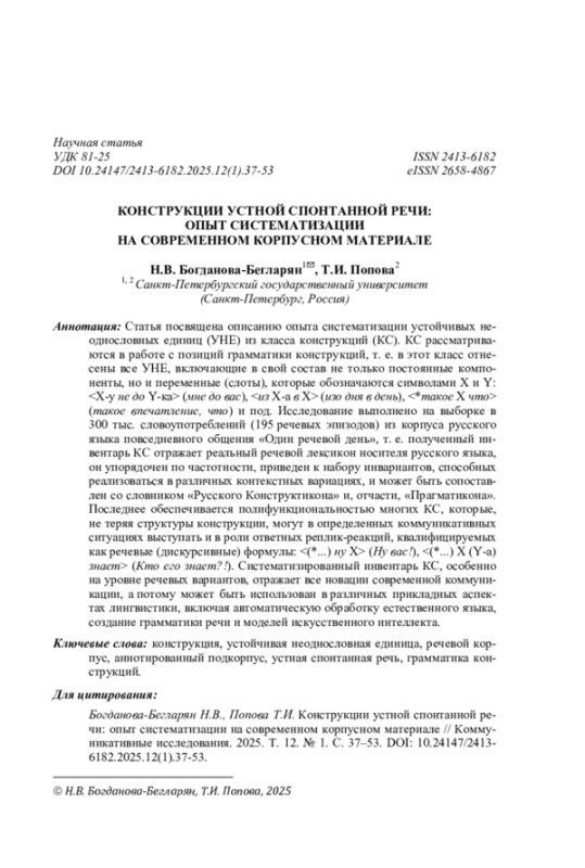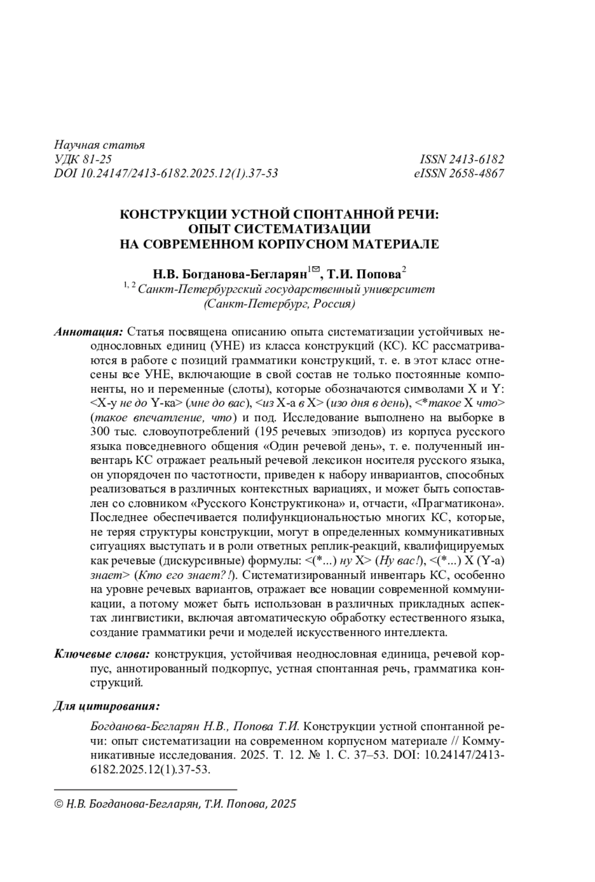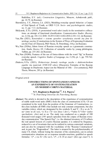 11. Попова Т.И., Козырева П.Т. От идиомы до конструкции: результаты экспертной разметки устойчивых неоднословных единиц (без + Х) в корпусе “Один речевой день” // Русская грамматика в динамике: сб. науч. ст. по материалам VIII междунар. симп. (Н. Новгород, 9-13 окт. 2024 г.) / отв. ред. Е.В. Маринова. Н. Новгород: НГЛУ, 2024. С. 228-233. EDN: HWPMFW