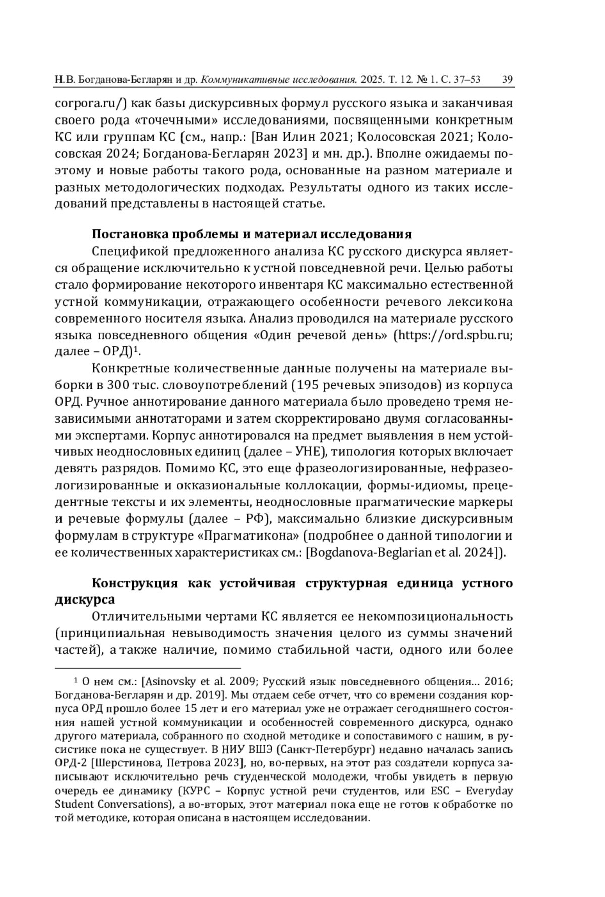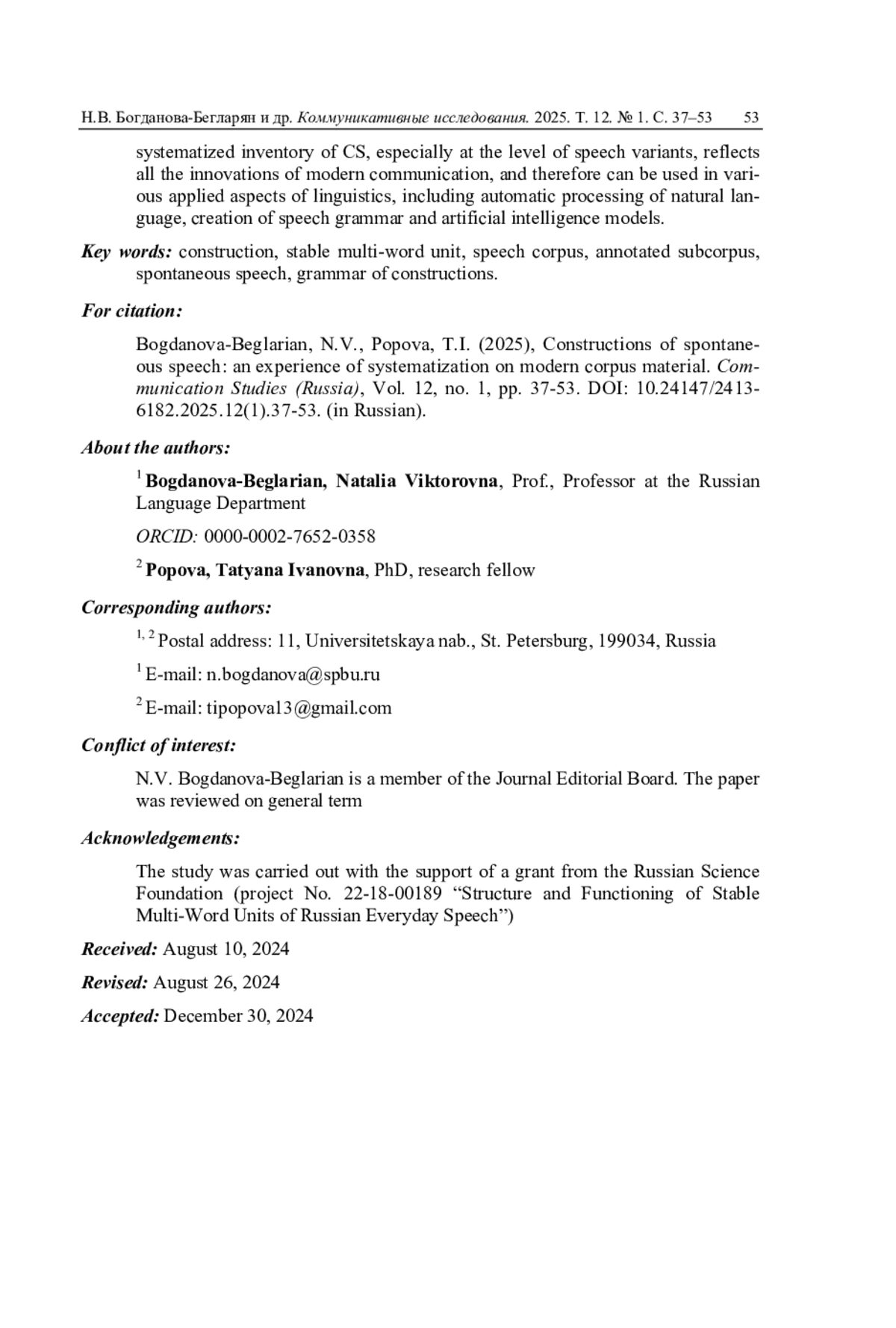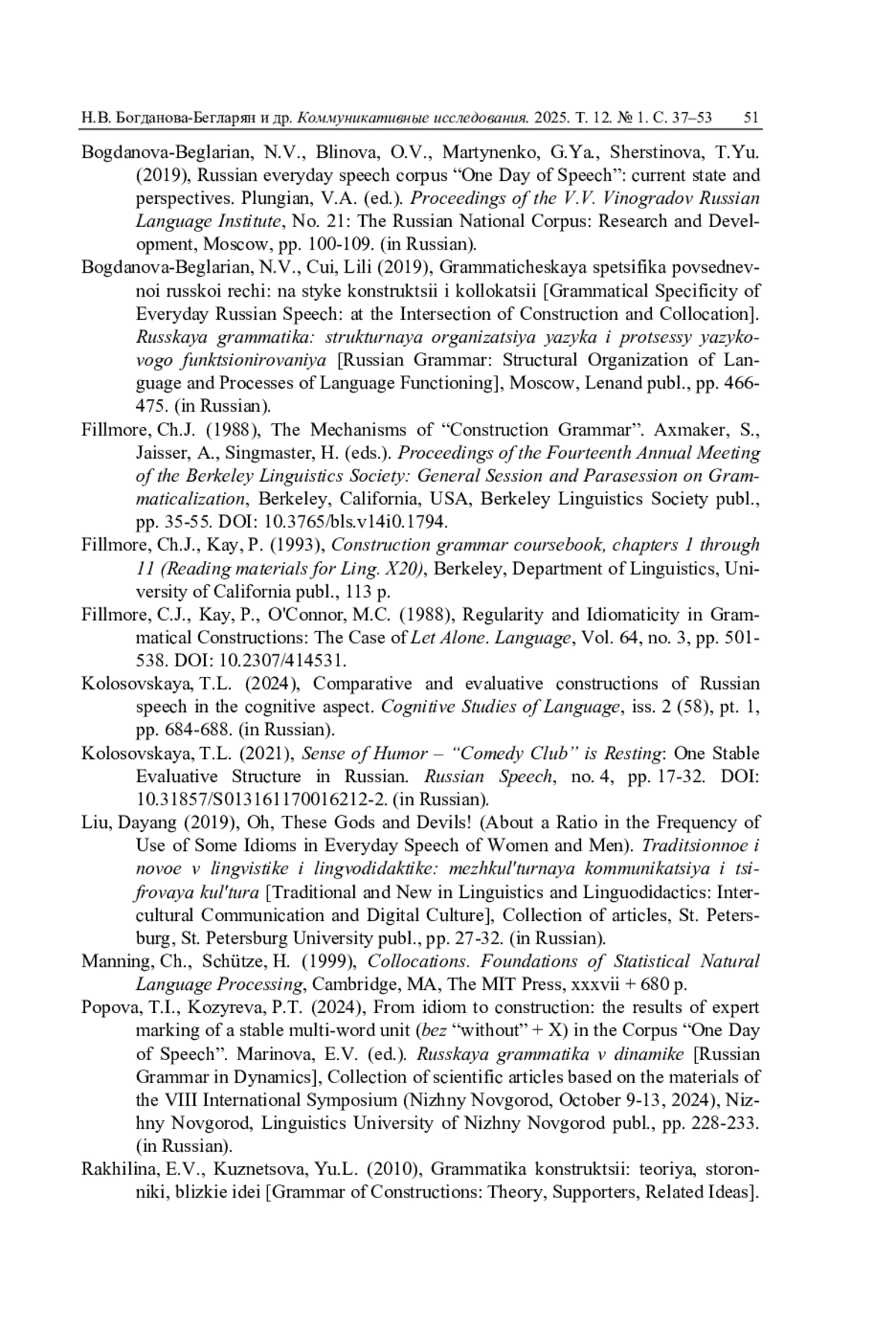19. Bogdanova-Beglarian N.V., Blinova O.V., Khokhlova M.V., Sherstinova T.Y., Popova T.I. Multiword Units in Russian Everyday Speech: Empirical Classification and Corpus-Based Studies // Speech and Computer: 26th International Conference SPECOM 2024: Proceedings / eds. A. Karpov, V. Delić. Cham: Springer, 2025. Pt. I. P. 187-200. (Lecture Notes in Computer Science; Vol. 15299). DOI: 10.1007/978-3-031-77961-9_14