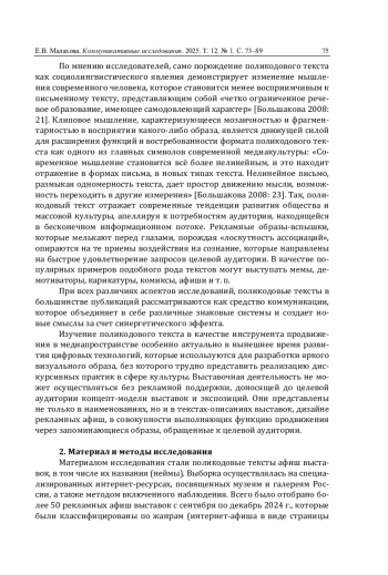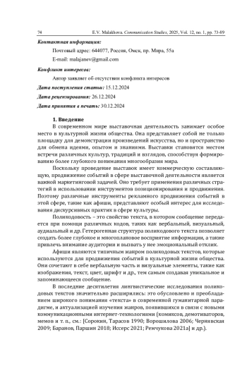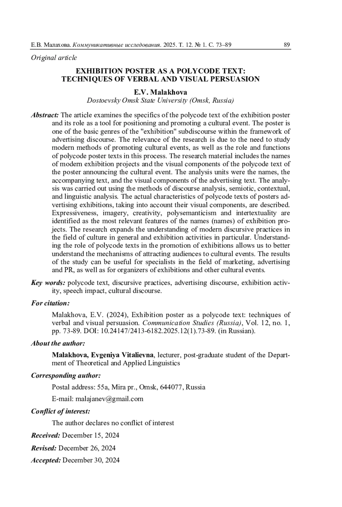 В статье рассматривается специфика поликодового текста афиши выставки и его роль как инструмента позиционирования и продвижения культурного события. Афиша является одним из базовых жанров «выставочного» субдискурса в рамках рекламного дискурса. Актуальность исследования обусловлена необходимостью изучения современных методов продвижения культурных событий, а также роли и функций поликодовых текстов афиш в этом процессе. Материалом исследования стали названия современных выставочных проектов и визуальные компоненты поликодового текста афиши, анонсирующей культурное событие. В качестве единиц анализа выступали наименования, сопроводительный текст, визуальные компоненты рекламного текста. Анализ осуществлялся с привлечением методов дискурс-анализа, семиотического, контекстуального, лингвостилистического анализа. Описаны актуальные характеристики поликодовых текстов афиш, рекламирующих выставки, с учетом их визуальных компонентов. В качестве наиболее актуальных признаков названий (неймов) выставочных проектов определены выразительность, образность, креативность, полисемантичность и интертекстуальность. Исследование расширяет представления о современных дискурсивных практиках в сфере культуры в целом и выставочной деятельности в частности. Понимание роли поликодовых текстов в продвижении выставок позволяет лучше понять механизмы привлечения внимания аудитории к культурным событиям. Результаты исследования могут быть полезны для специалистов в области маркетинга, рекламы и PR, а также для организаторов выставок и других культурных мероприятий